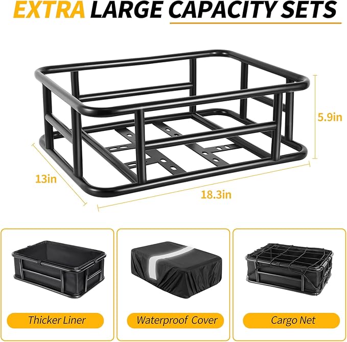 Bike Basket Rear with Liner,Waterproof Cover,Cargo Net Large Rear Bike Basket,Heavy Duty Bicycle Rear Basket for Electric Bike, Ebike,Great for Bike Trip,Carrying Grocery,Ball,Dog