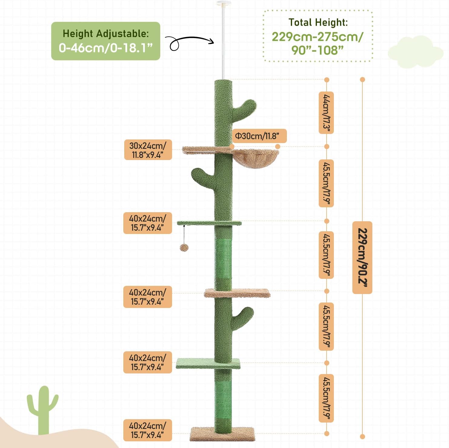 - Unique Cactus Shape: This floor to ceiling cat tower with color-saturated look, which suitable for average cats will be sure to grab full attention of your cat and also perfectly fresh your living room. Also, this multi-functional tall cat tree combines five platforms, one hammock, dangling balls and fully sisal-covered scratching post to meet indoor catβs various needs.