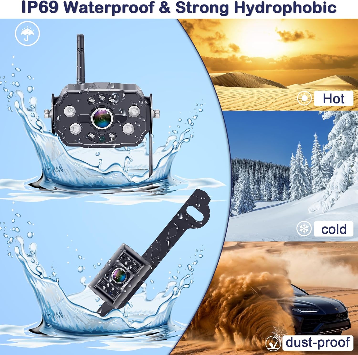 - 100% Waterproof: The backup camera for rv utilizes the latest nano-coating sealing technology with IP69 grade waterproof performance, which can work perfectly and provide clear images in extreme environments from -22Β°F to 176Β°F. This rv camera system wireless is like a brave guardian from any water or fine particles, tenaciously resisting wind, rain, dust, high and low temperatures, which enhances the safety index and strengthens the service life, providing a safer guarantee for driving.