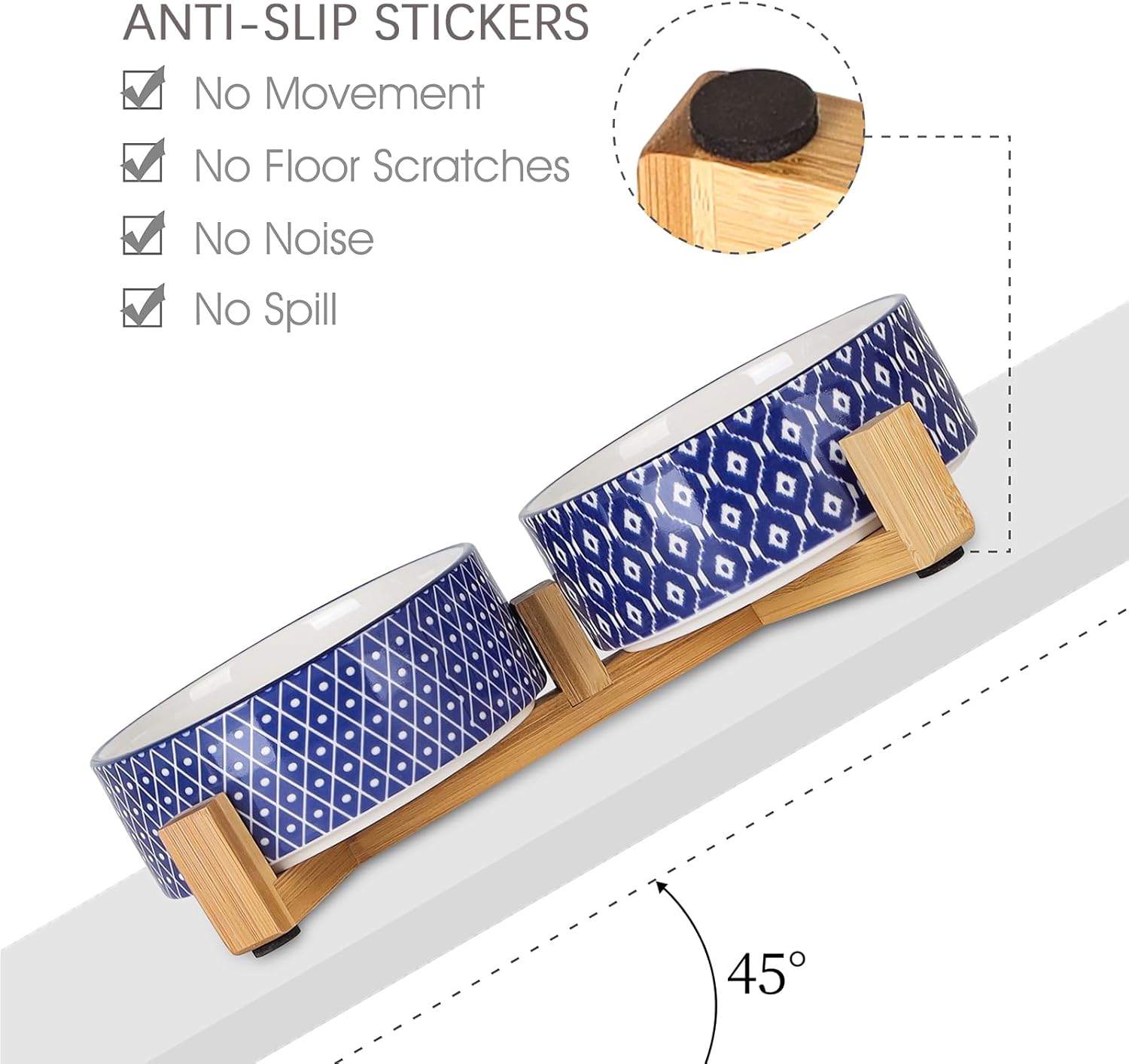 - NON-SLIP & ANTI-SCRATCHED WOODEN STAND BASE- Each pet bowl set is paired with Non-skid pads that can stick under the wooden stand and also avoid scratching the floor. This triangle stand has a certain weight base that can keep the dog bowls set to stay in place and never move around.