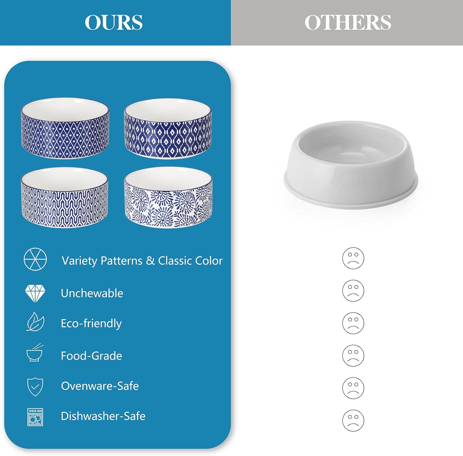 - HEALTHY STURDY CERAMIC MATERIAL - Our dog food dishes are made of premium ceramic material, which has no harmful lead & cadmium, odorless, sturdy, and healthy for your furry friends. And the ceramic pet bowl helps your dog away from chin disease. Its smooth glaze finish makes it wash by hand or dishwasher easily. You can also heat the food in the microwave for your pets at any time.