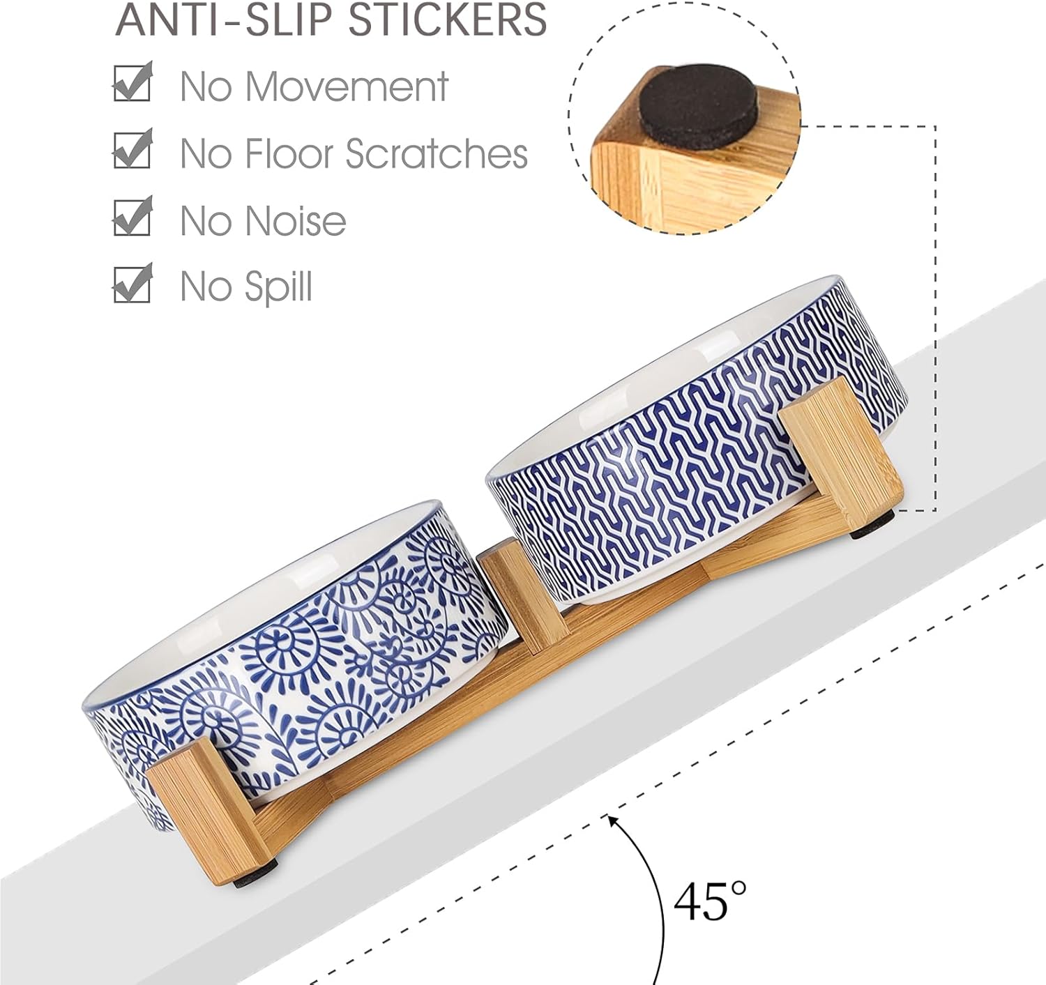 - NON-SLIP & ANTI-SCRATCHED WOODEN STAND BASE- Each pet bowl set is paired with Non-skid pads that can stick under the wooden stand and also avoid scratching the floor. This triangle stand has a certain weight base that can keep the dog bowls set to stay in place and never move around.