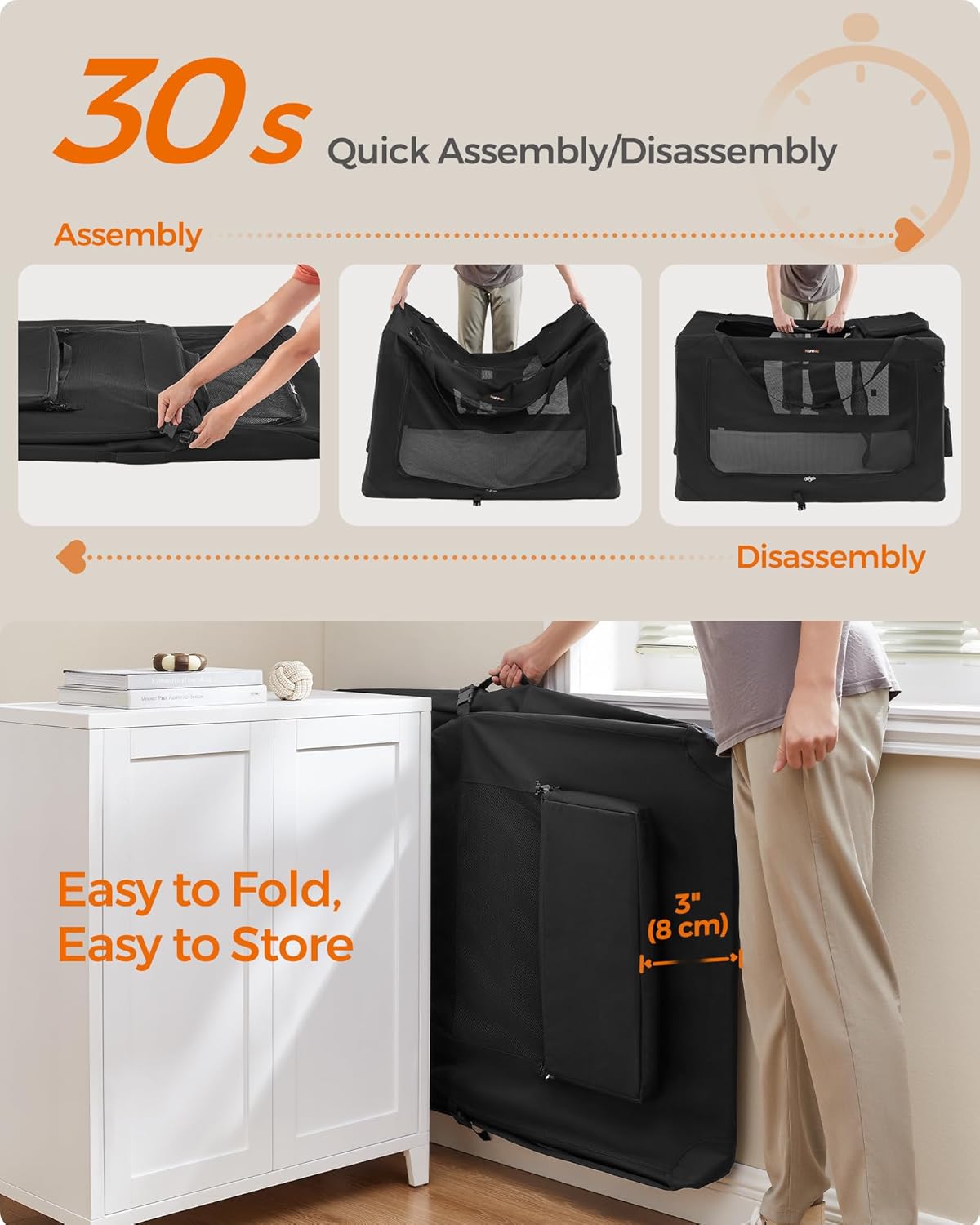 - 【QUICK ASSEMBLY & EASY FOLDING】The dog crate can be assembled in 30 seconds without tools and can be stored in the car or in the corner of your home after folding. It can be easily carried for indoor use or traveling, giving your dog a warm home anytime