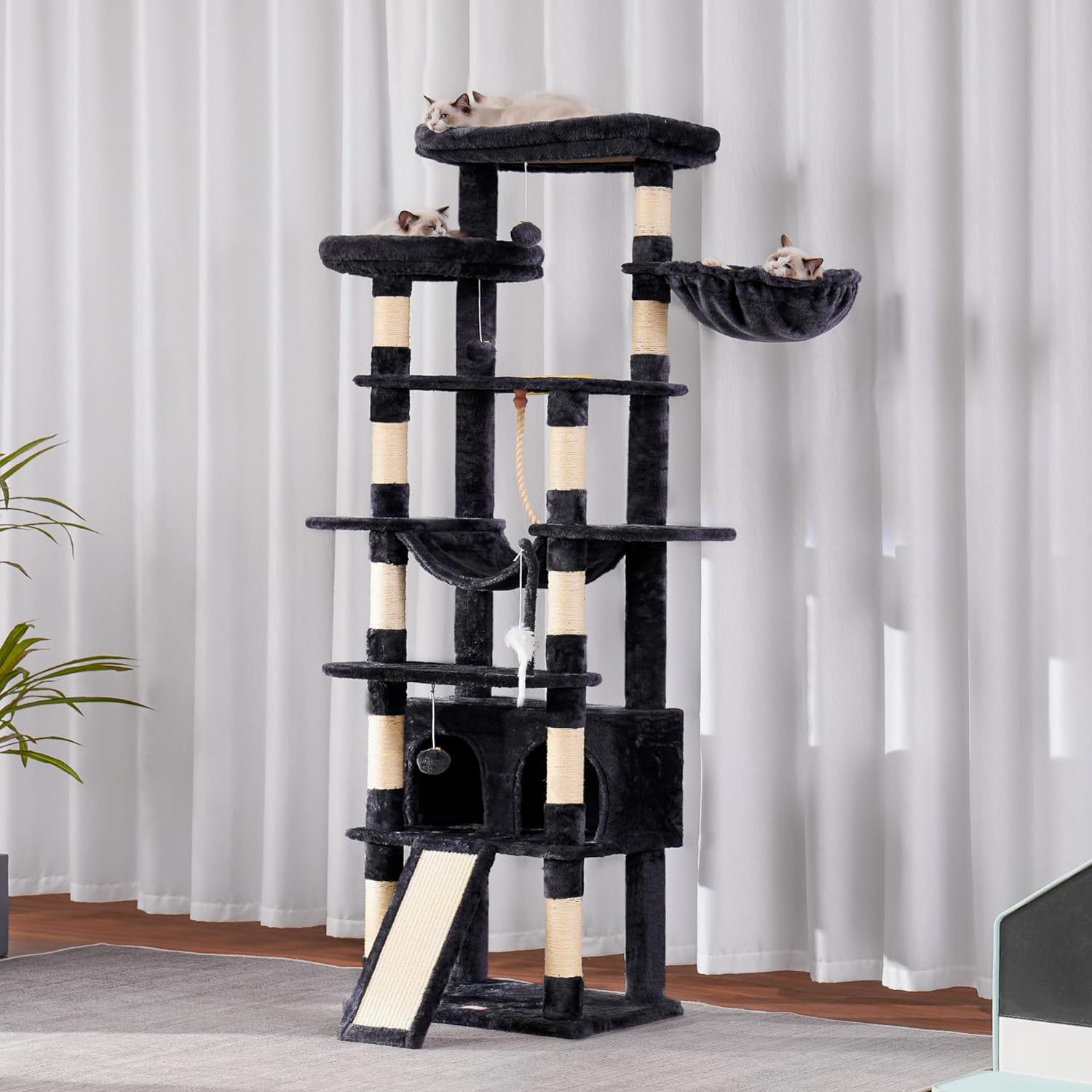 - [78" Tall, Multifunctional Design] Step-like jump multi-layer structure design of cat furniture, convenient for cat's scratching, climbing, sleeping, and exercising; The big cave, basket and hammock offer private space for catnap or hiding; Hammock to lounge and enjoy the leisure time