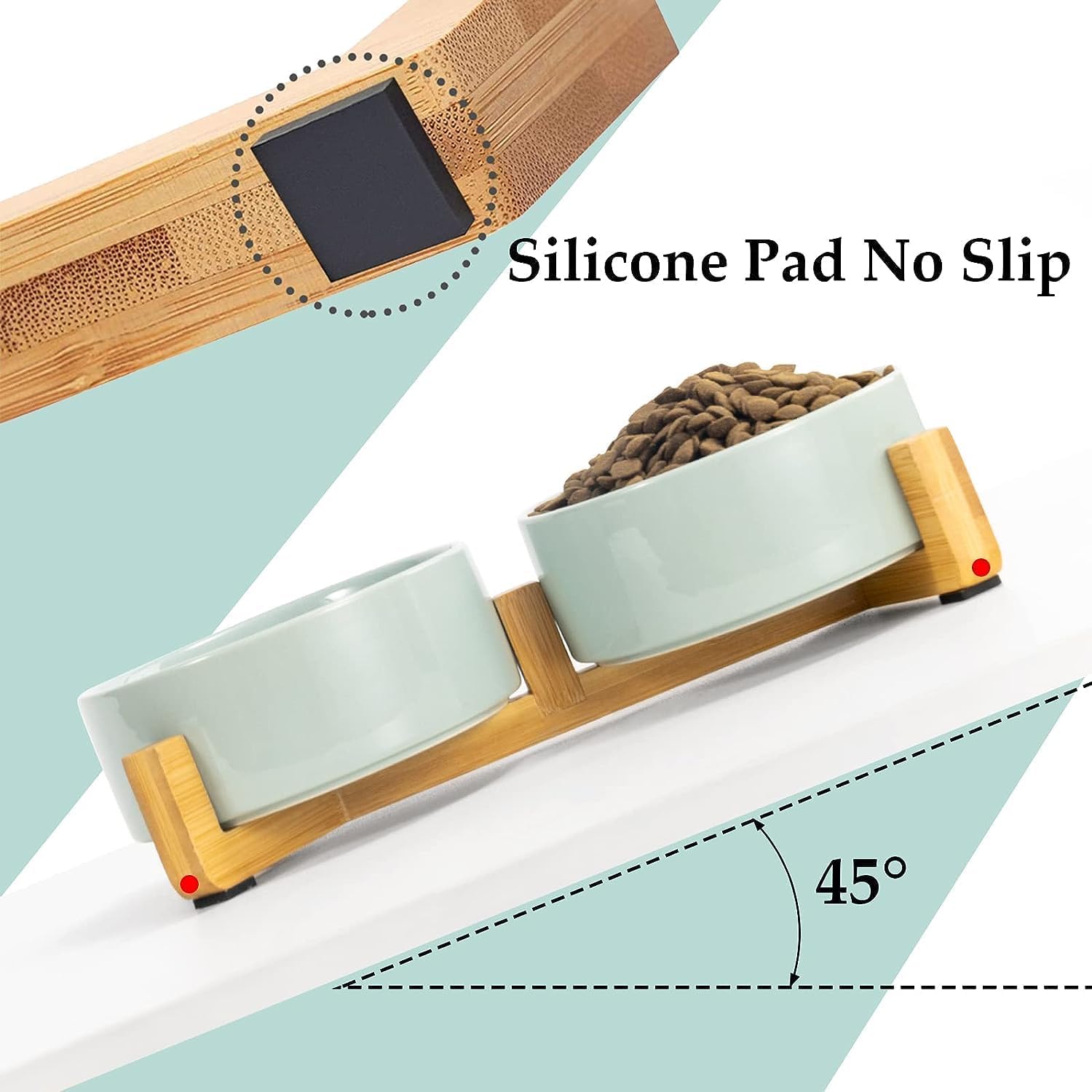 - [Double Bowl Design]:One dog bowl for food and one for water, Each ceramic cat bowl has a Unique wooden stand, raising the dishes closer to your pet for more comfortable eating