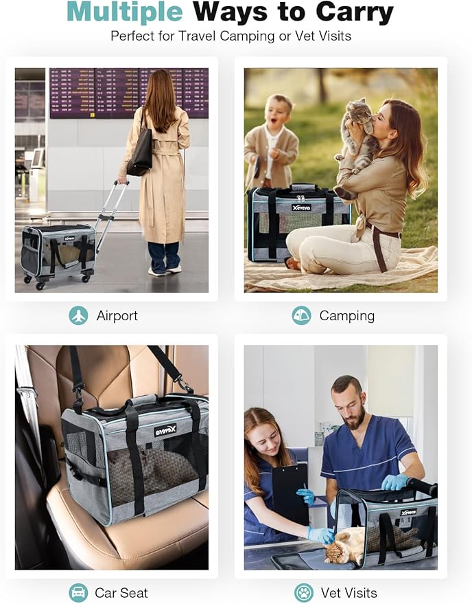- Designed for Travel: This dog carrier with wheels has a telescopic handle, removable base with wheels. The 360° rotating wheel provides a stable and quiet ride on any surface. The rolling cat carrier also features a carrying handle and adjustable shoulder strap for easy transport.