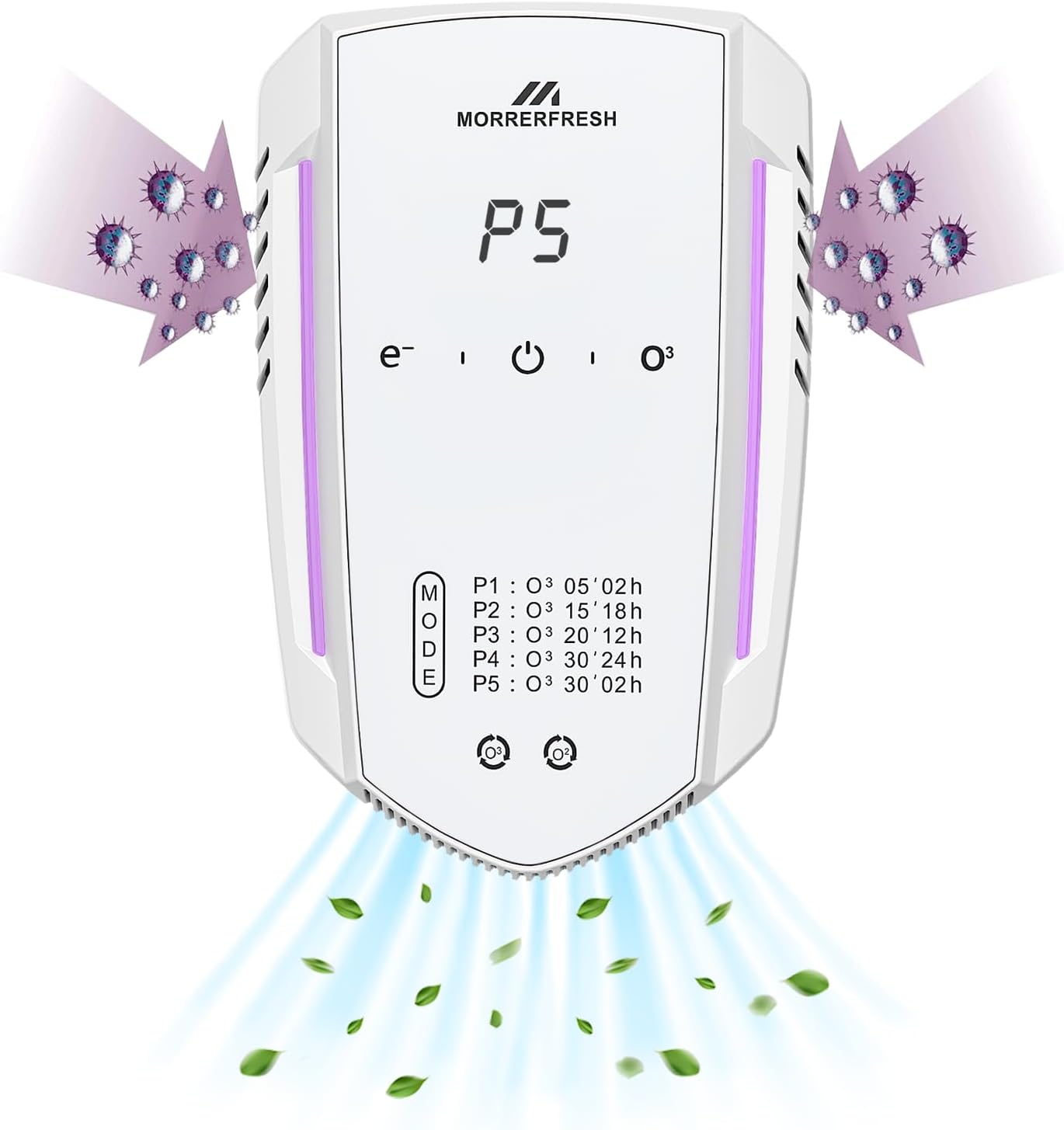 - 5 Adjustable Modes: P1: 5 min ozone, 2-hr pause (50β100 sq. ft.) β P2: 15 min, 8-hr pause (100β150 sq. ft.) β P3: 20 min, 12-hr pause (150β200 sq. ft.) β P4: 30 min, 24-hr pause (200β250 sq. ft.) β P5: 30 min, 2-hr pause (over 250 sq. ft. or for rapid deodorizing). Tip: If new odors appear during pauses (e.g., cat litter odor), use P5 for the shortest pause time