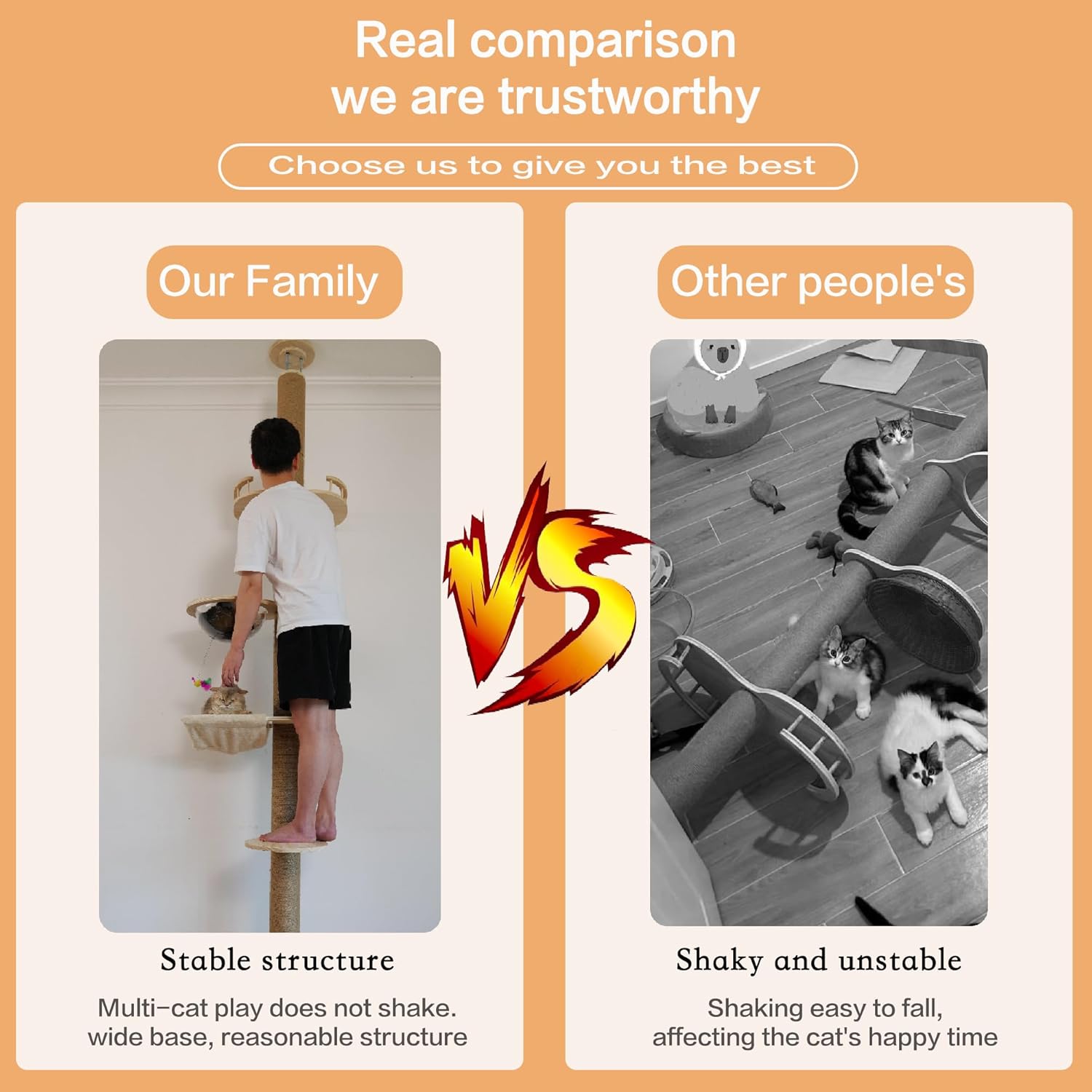 - Sturdy Floor-to-Ceiling Cat Tree with Stable Structure The top structure of this heavy-duty floor-to-ceiling cat climber is reinforced with 3 heavy-duty steel screws and paired with a stable base, supporting up to 140 lbs to ensure zero wobble for multi-cat households. The innovative design requires no drillingβsimply adjust the height between 55" and 120" to fit standard to extra-tall ceilings, providing a safe climbing experience without damaging walls.