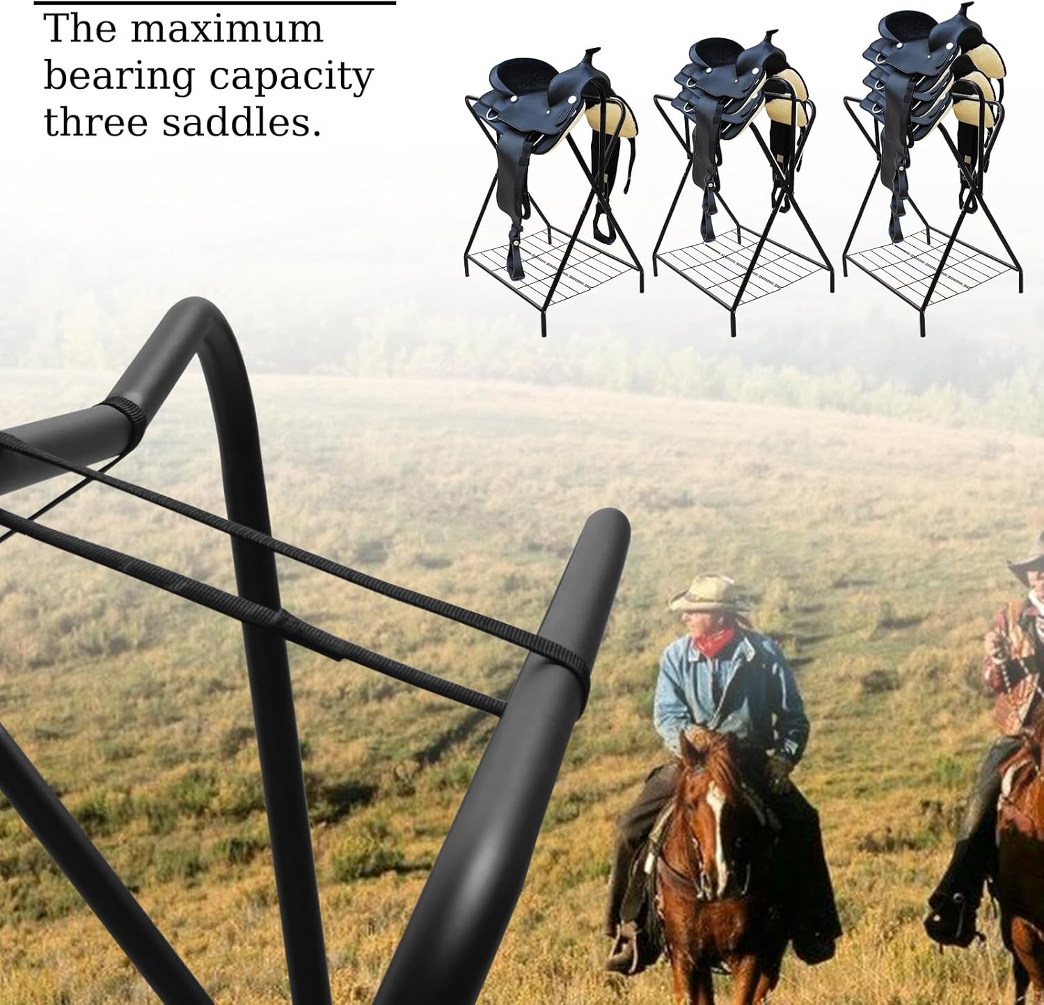 - Portable Design : Horse Saddle Storage Rack combines lightweight, sturdy construction with practical design, folding flat for effortless storage and ideal for daily use. It measures 27.2 x 19.3 x 35.8 inches and weight 7 pounds. The rack's shaped design securely holds the saddle in place, minimizing the risk of slipping. Featuring a collapsible wire chassis, it offers additional storage and folds flat within seconds for convenience.