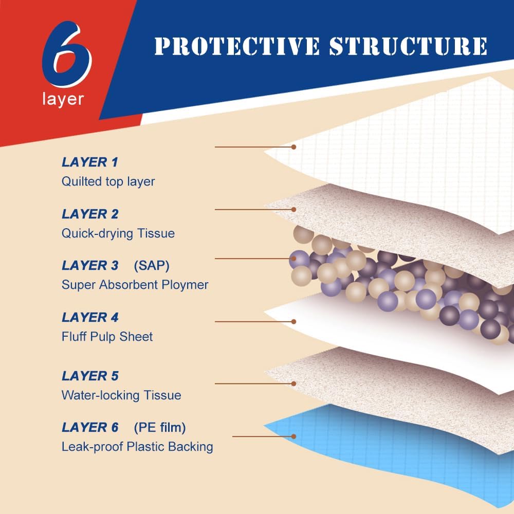 - 【6-Layer Leak-Proof Design】: Our puppy pads feature a 6-layer leak-proof design, including a quick-drying quilted surface and leak PE film that effectively locks in wetness.This ensures that any liquid stays contained and does not leak through, protecting your floors and carpets from potential damage.