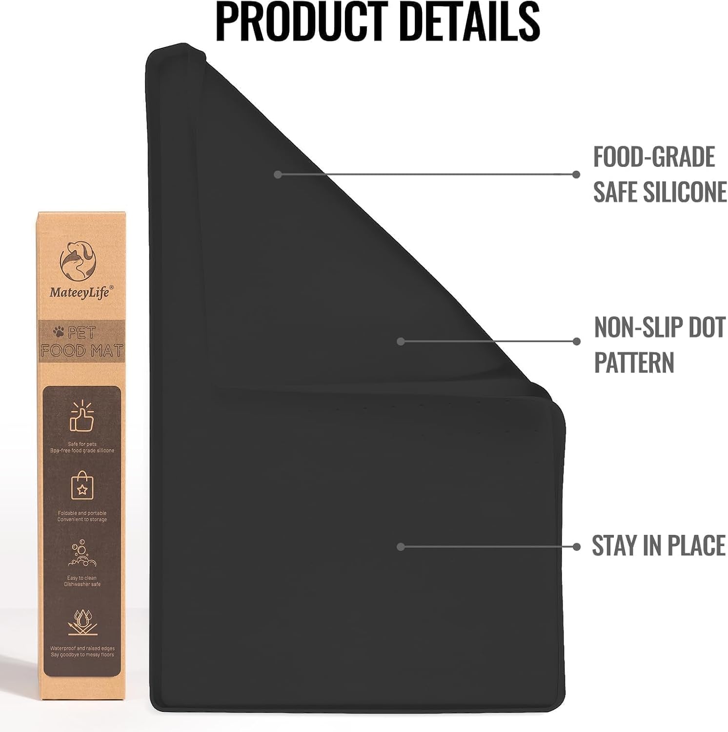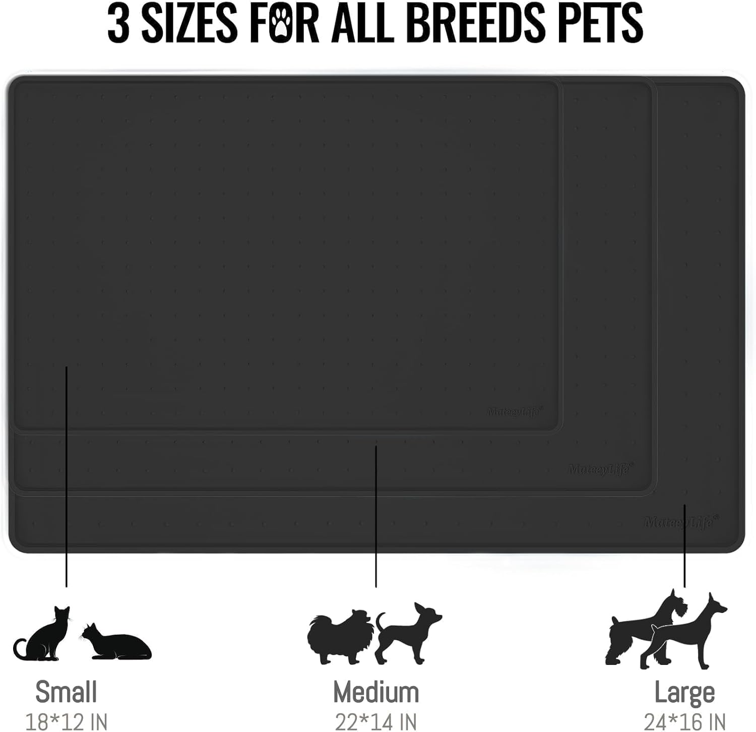 MateeyLife Dog & Cat Food Mat for Floors Waterproof, Nonslip Dog Bowl Mats for Food and Water, Dog Feeding Mats with Raised Edges, Silicone Cat & Dog Water Matt Tray for Messy Drinkers, 18"x12", Black