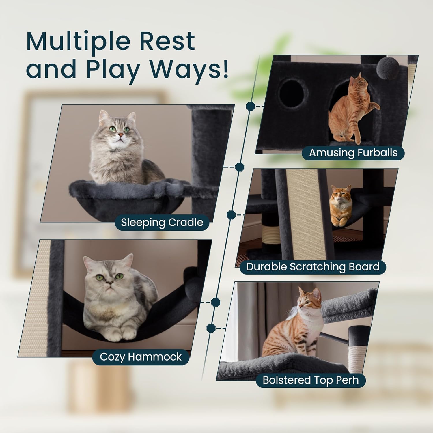 - COMFY HOME FOR ENTERTAINING: A multi-level structure is designed for more than one cat to play at the same time. Padded plush perches provide a cozy place to rest; sisal rope coiled posts and scratching ladders help encourage scratching behavior