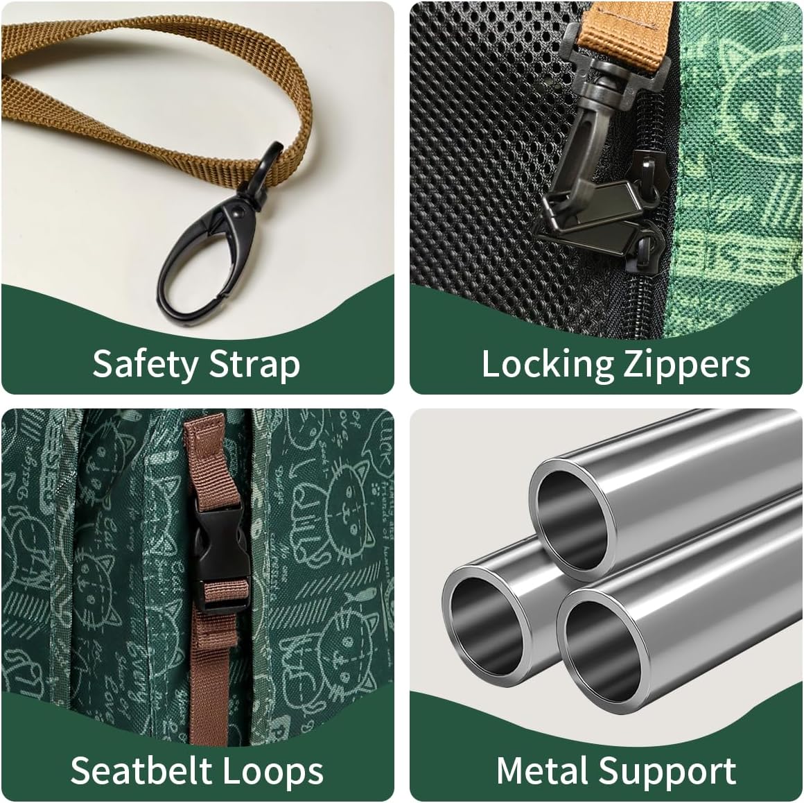 - SAFETY DESIGN- Each access has a zipper lock to prevent cats from escaping. On the side have seatbelt loops, can fix the carrier in the car. The internal metal support structure may also provide good protection for pets.