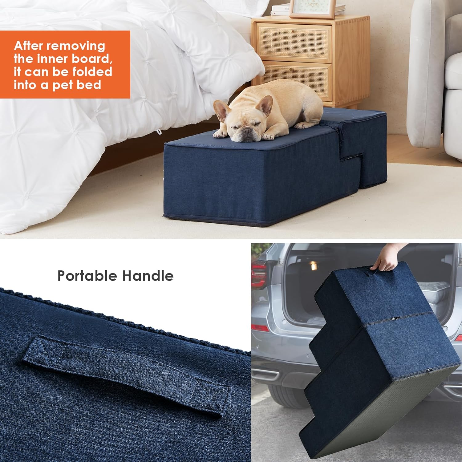 - STEADY & FOLDABE: With a 30D high density foam and eco-friendly support board, this dog stair offers enhanced stability. It can also be folded into a basic dog bed for your furry puppy to sleep.