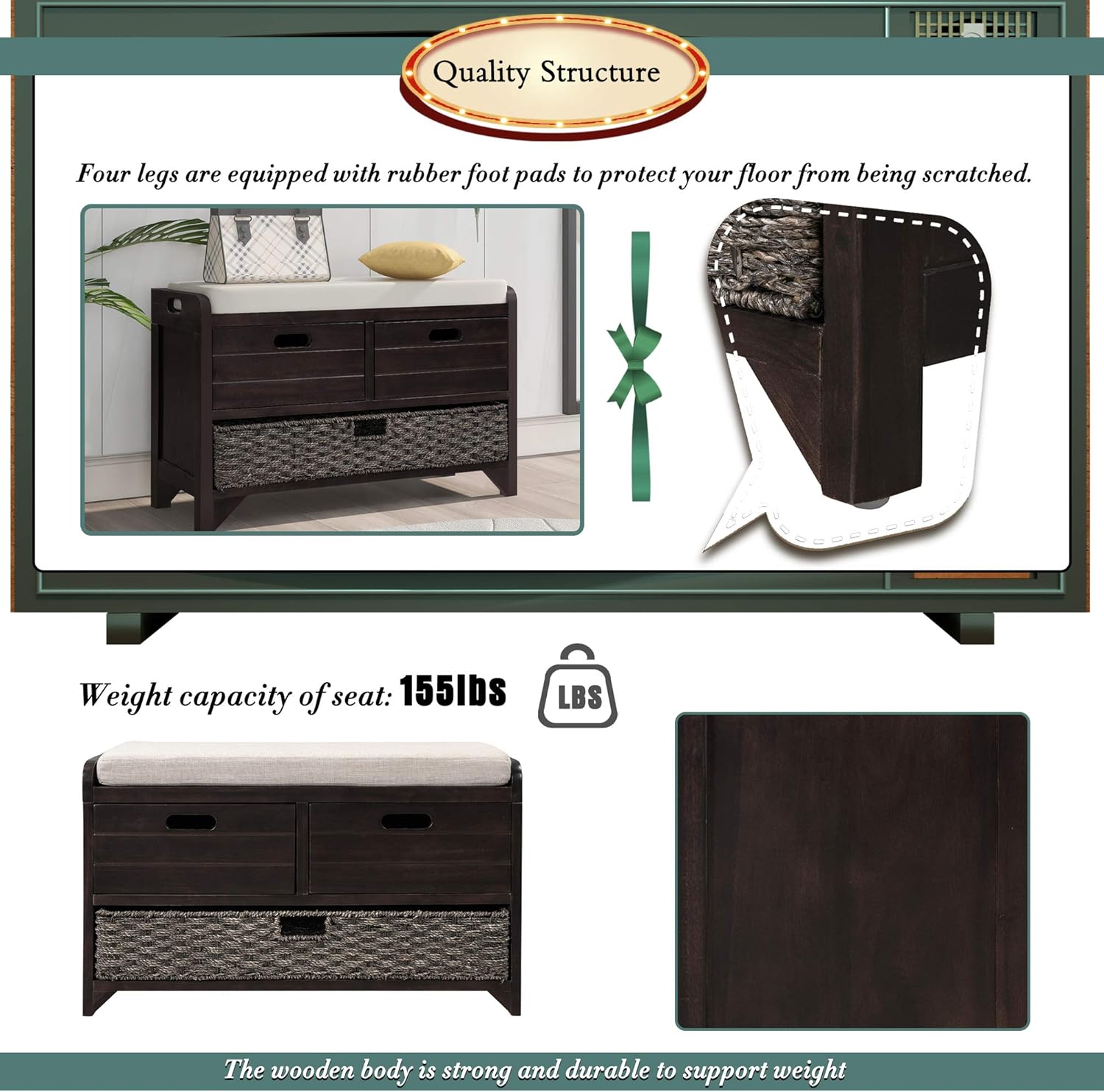 Storage Bench with Removable Basket 2 Drawers Fully Assembled Acacia Wood Shoe Bench Standing Shoe Rack Removable Cushion for Living Room, Entrance Hallway, No Assembly Required Espresso
