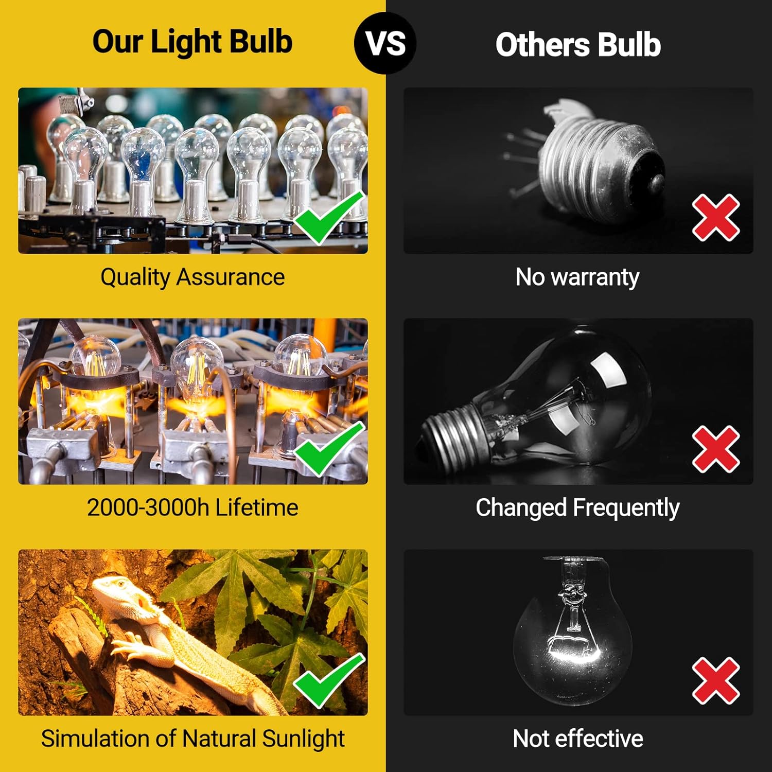 - γLong Service LifeγAdopt updated vacuum aluminizing process technology, the efficiency of the heat lamp bulb increase by 35% and save more energy. Good quality results from upgraded process and the reptile heat lamp can be used over 2000 hours, max 3000 hours.