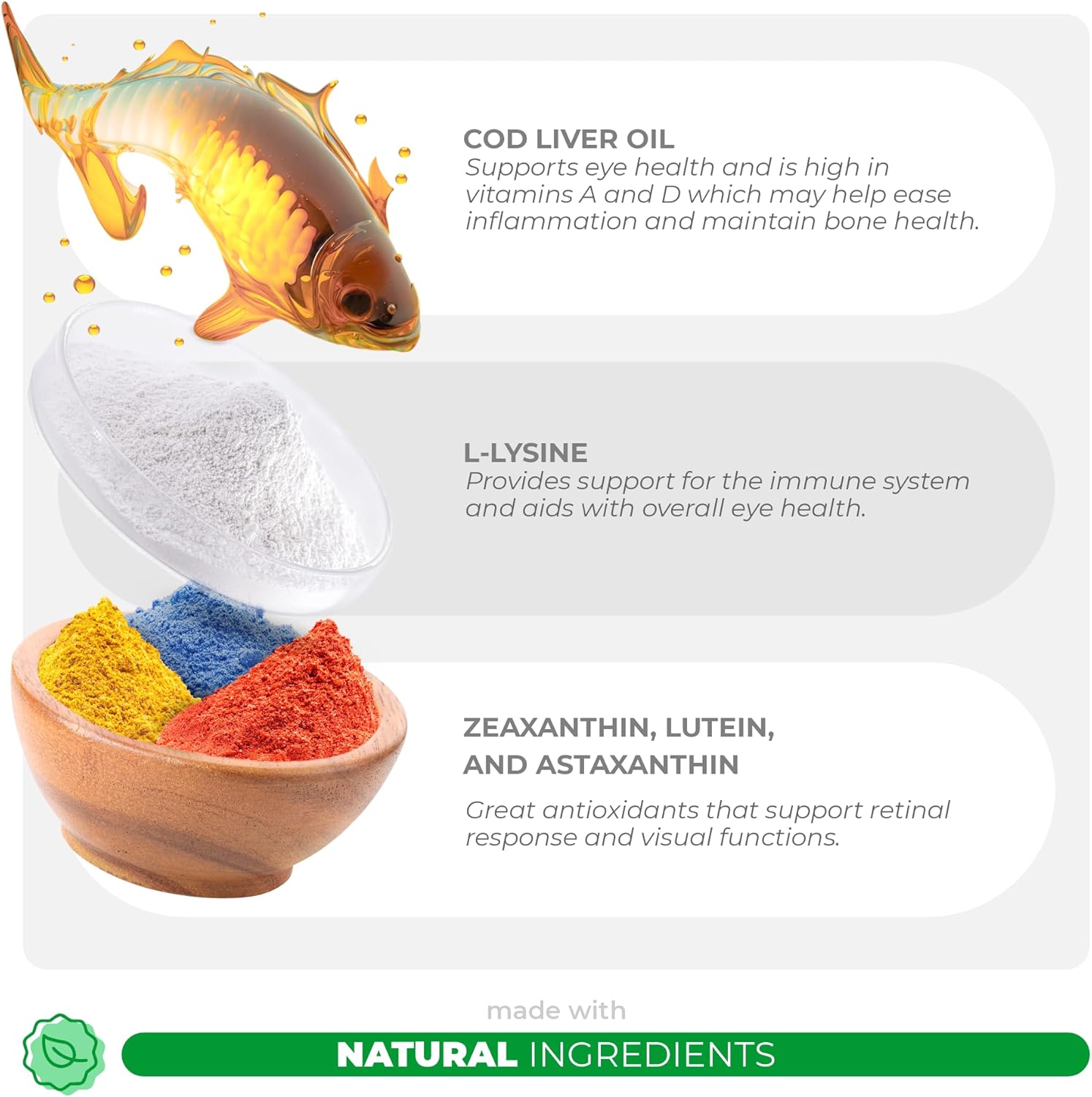 - Eye Function Dog Vitamins - Our formula has ingredients like Cod Liver Oil, Bilberry Fruit, Astaxanthin, Vitamins C and E to help support overall eye function.
