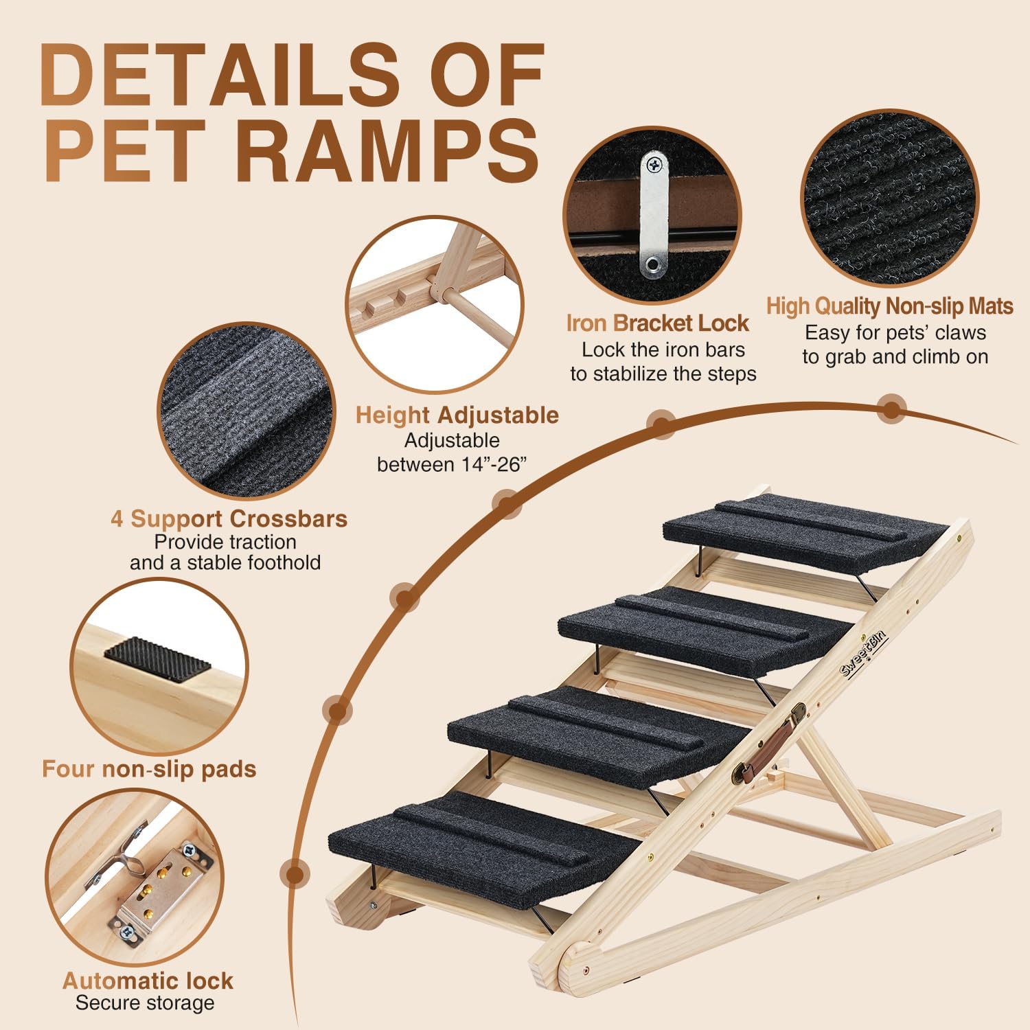- ✅ANTI-SLIP SAFETY FEATURES - Our wooden dog ramps are thoughtfully crafted to alleviate muscle and joint strain. The non-slip fabric cover provides traction for pets' paws, with 4 anti-slip crossbars preventing sliding on inclines. Designed with bottom anti-slip pads, our pet steps offer protection for your floors.