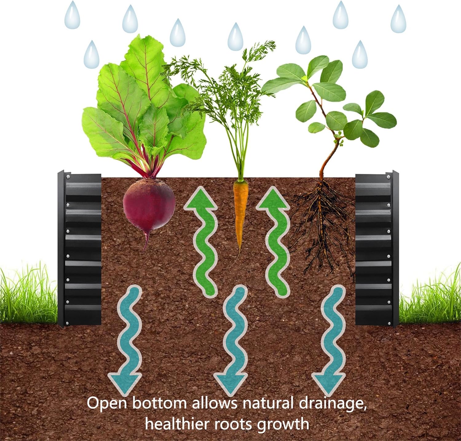 - OPEN BOTTOM: Sits on the ground garden bed, allows natural drainage, prevent waterlogging and root rot. It encourages the plantsβ roots to grow deep into the ground, promoting stronger and healthier plants.