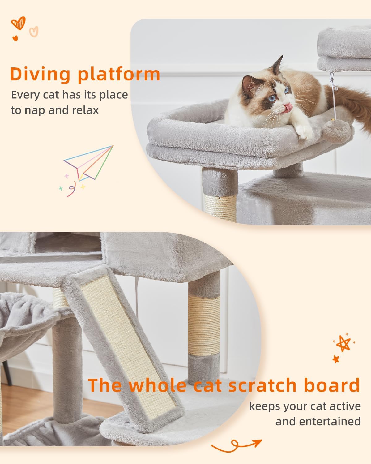 Taoqimiao Cat Tree 57.5-Inch, Cat Tower for Indoor Cats Large Adult, Extra Large Cat Condo, 8 Sisal Scratching Posts, Metal Frame Cozy Hammock, Durable Scratch Board, 2 Top Perches, Light Gray MS026W