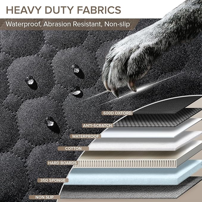 - 7-LAYER MATERIALS FOR STRONG SUPPORT, PROTECT AND COMFORT - Constructed with heavy duty materials including 600D scratch-resistant Oxford, waterproof fabric, thickened hard bottom boards, 35D soft sponge and cotton layers for added comfort and non-slip fabric that wouldnβt slide. Pet seat cover for back seat safeguards trucks from wear, water, and stains, extra-high door protector prevents scratches, allowing dogs to hop in and out joyfully, leaving you with perfectly preserved interio