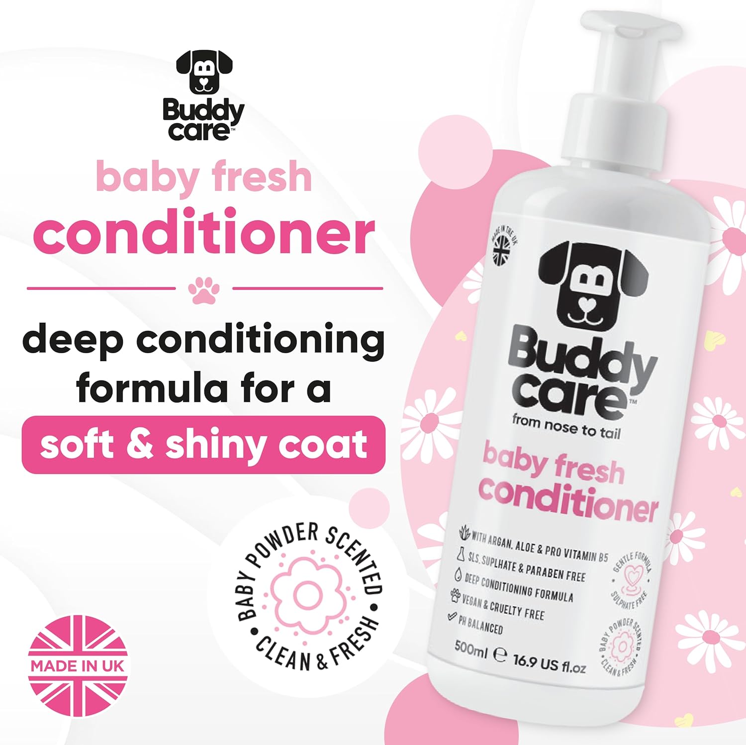 - SOOTHING DOG CONDITIONER β Buddycare soothing, detangling Baby Fresh dog conditioner works alongside our range of dog shampoos and is the ideal final step in your petβs grooming routine. Simply massage into your dogβs wet fur after our cleansing dog shampoo, focusing on the matted and tangled areas. Rinse thoroughly with warm water and towel dry for a clean, baby fresh scent and silky-soft finish.