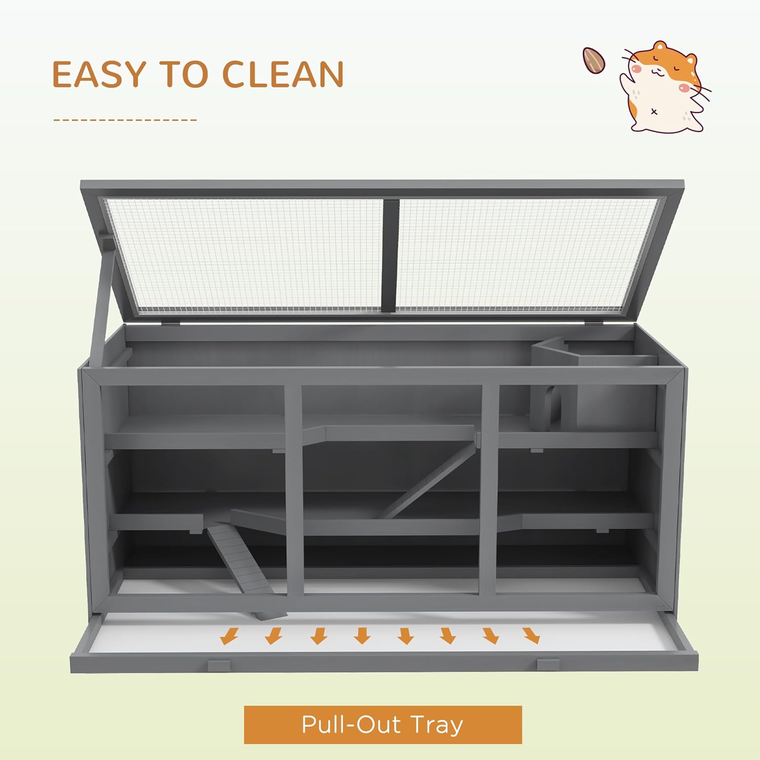 PawHut 45" Extra Large Wooden Hamster Cage, 3-Layer Chewproof Rat Cage with Opening Roof, Hut, Ramps, for Gerbil, Dwarf & Syrian Hamsters, Gray