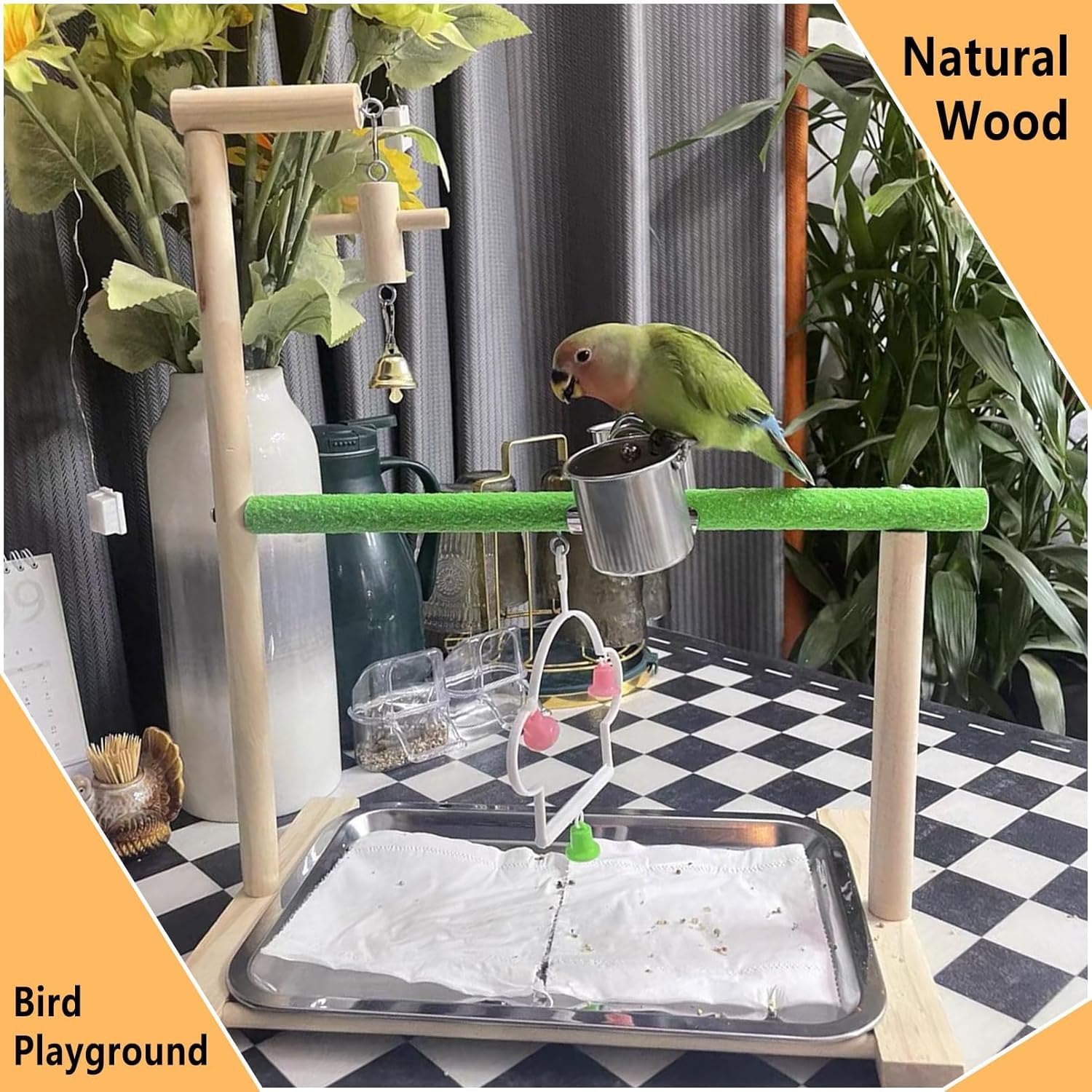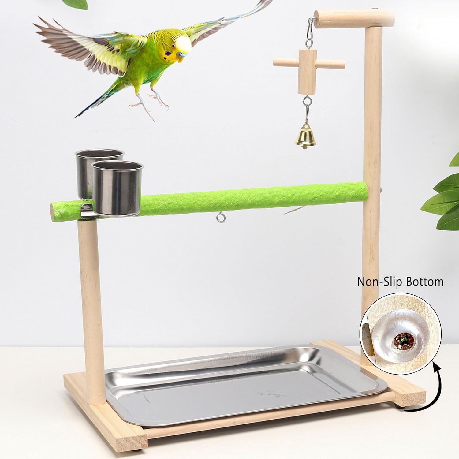 - γThoughtful and Practical Designγ: The bird play stand features two stainless steel cups for your bird to enjoy food and water after playtime. Additionally, the stainless steel tray at the bottom of the bird play stand provides a convenient and easy-to-clean surface, ensuring a clean and entertaining environment for your bird.