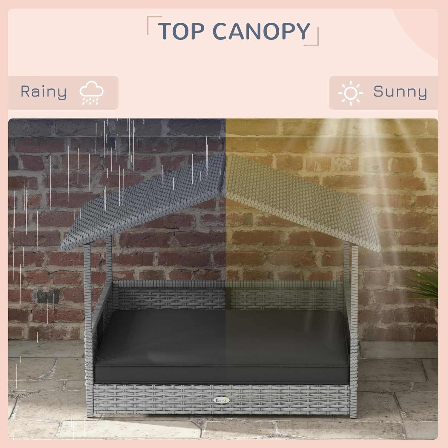 - Durable PE Rattan: Crafted from sturdy PE rattan, this outdoor dog bed with canopy is built to withstand the elements, providing a reliable shelter for your pet.