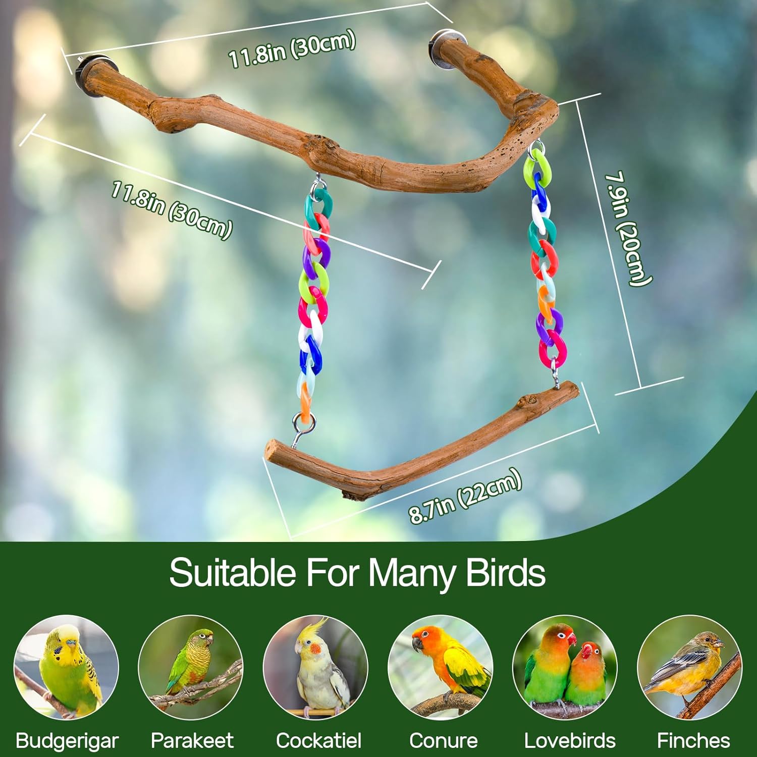 - 【Natural material】: The bird swing toy is made of natural grape wood. The surface is free of paint and wax, and the original texture protects the health of the bird's claws. Adorned with high - quality colored plastic chains, it can easily attract the attention of birds.