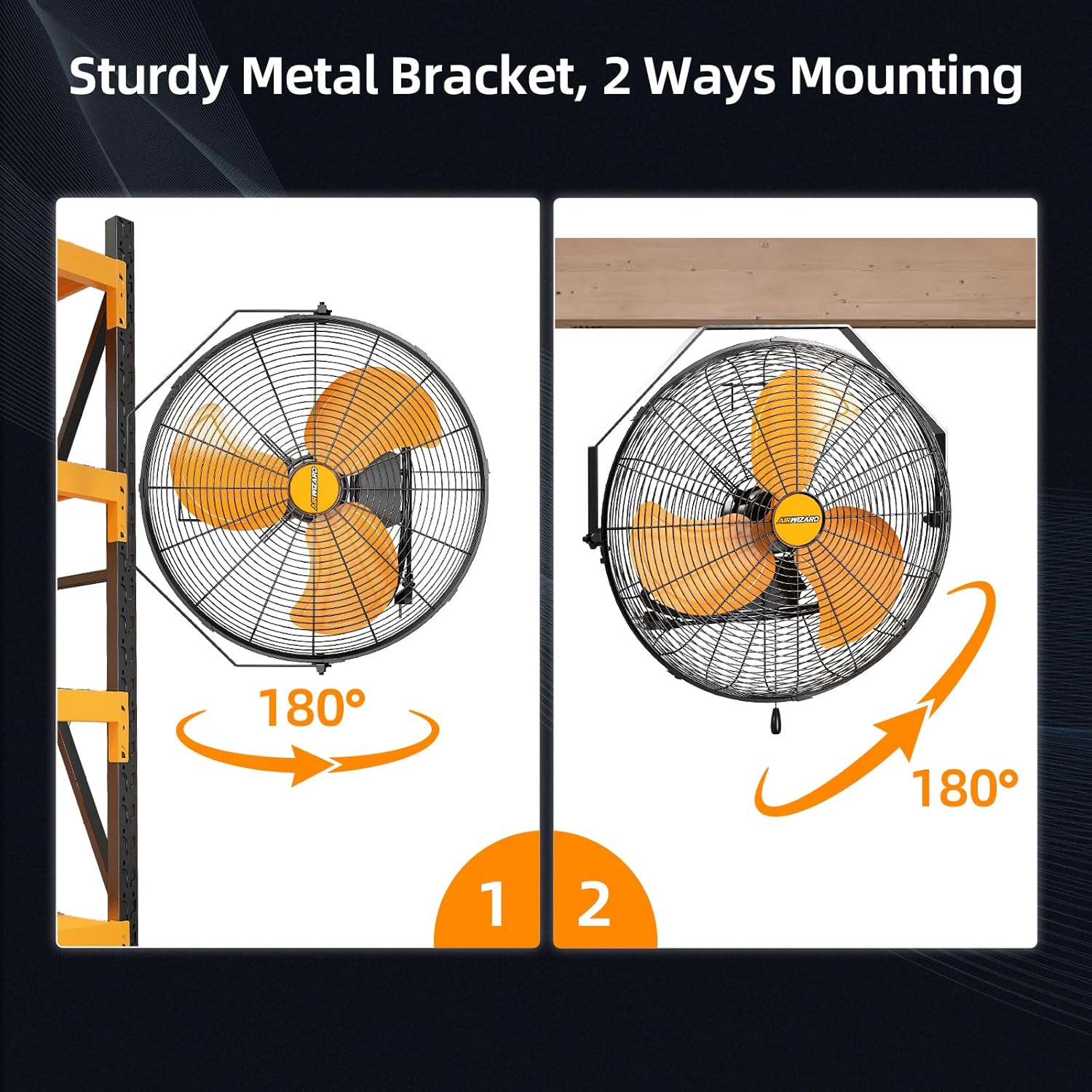 - 2 WAYS MOUNTING - You don't need to assembly the fan, using new bracket made out of power-coated steel construction hang the fan on the wall or the ceiling. This Industrial wall fan can tilt a full 180°, just switching the adjustment knob to direct air exactly where you need it.