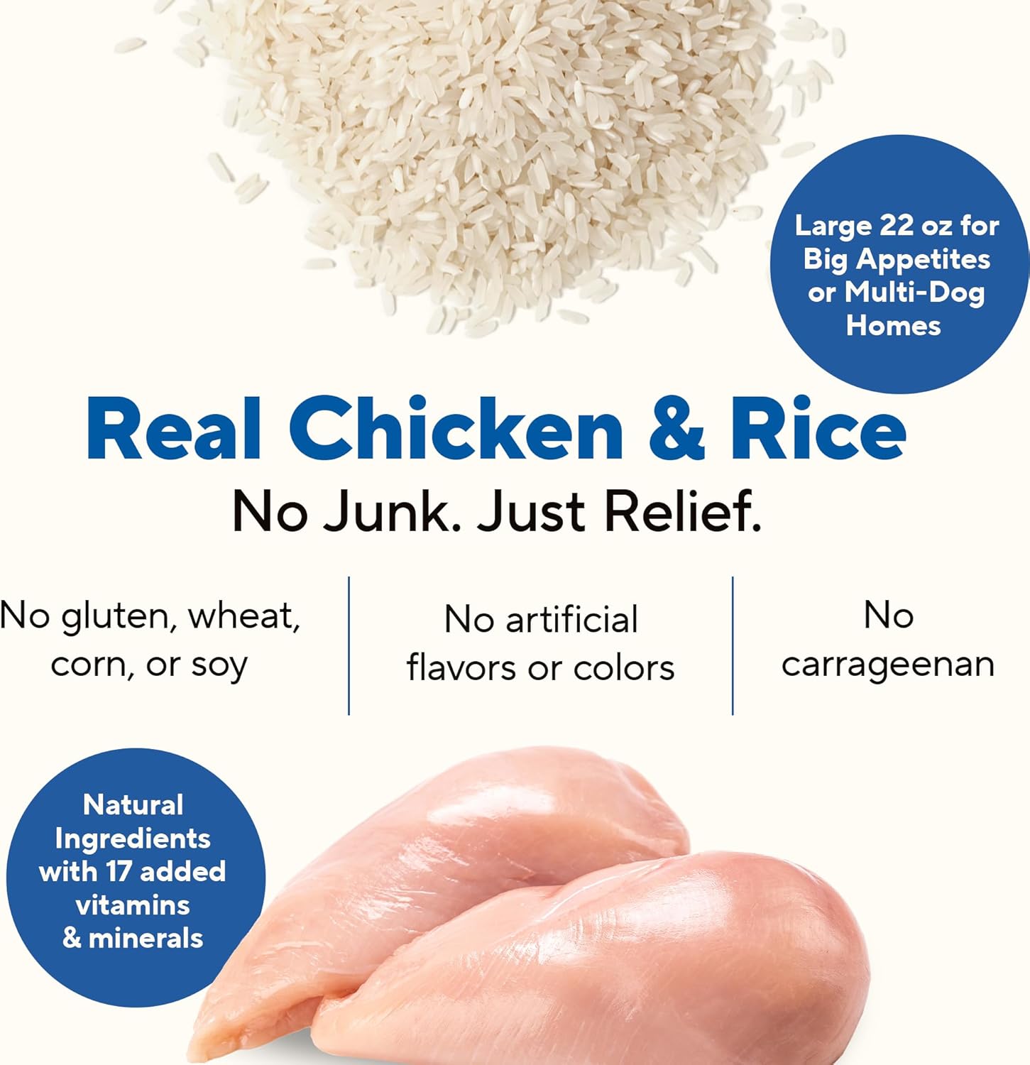 - Simple chicken and rice recipe is formulated to help calm your pup’s tummy during times of transition; also ideal for the dog prone to stomach upset. Great digestive health dog food.