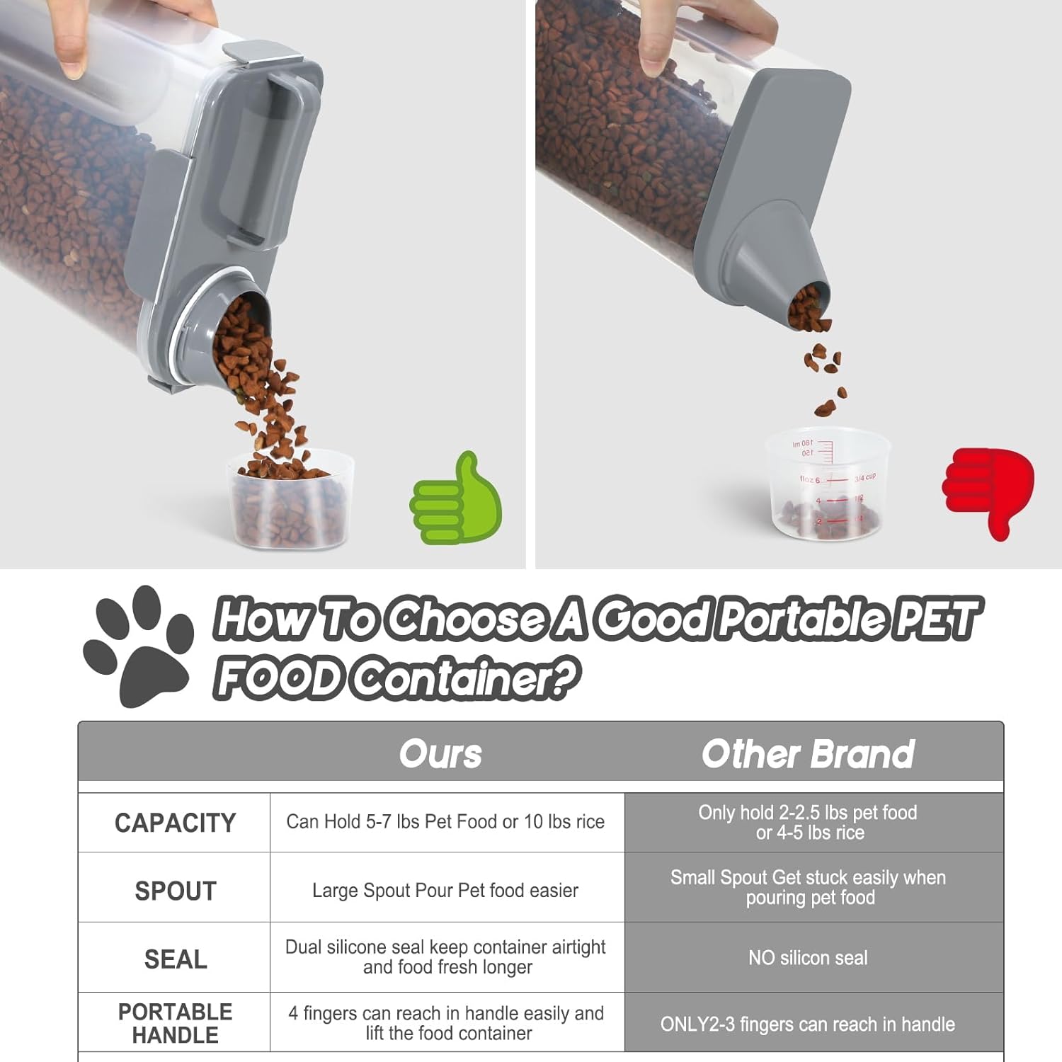 - SUPER LARGE CAPACITY : The airtight cat food container is designed with a large nozzle, so whether it is small or large pieces of food, it can be easily poured out without shaking the barrel. The handle design makes it easy to use and carry indoors and outdoors. It is also convenient to hold with one hand and tip the bucket to pour out food. The size of the pet food container is 14*12*8 inches, with a capacity of 5 liters. It can store pet food for 5 -7LBS, rice, dry food, cereals, etc. is about 10LBS, depending on the size and shape of the food. Can be easily stored and effectively save valuable space whether indoors, outdoors or during travel.