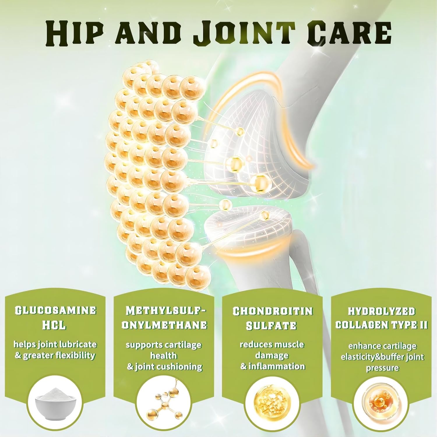 - Cartilage Health and Hips & Joints Care: Glucosamine for dogs helps cushion and lubricate joints. Chondroitin Sulfate supports healthy cartilage and shock absorption, MSM protects cartilage from degeneration and reduces joint pain, hydrolyzed collagen type II increases cartilage elasticity, and buffers joint pressure. The four best partners promote mobility and flexibility and strengthen hips and joints. TIP: our glucosamine is not sourced from shellfish, which avoids unnecessary dog allergies.