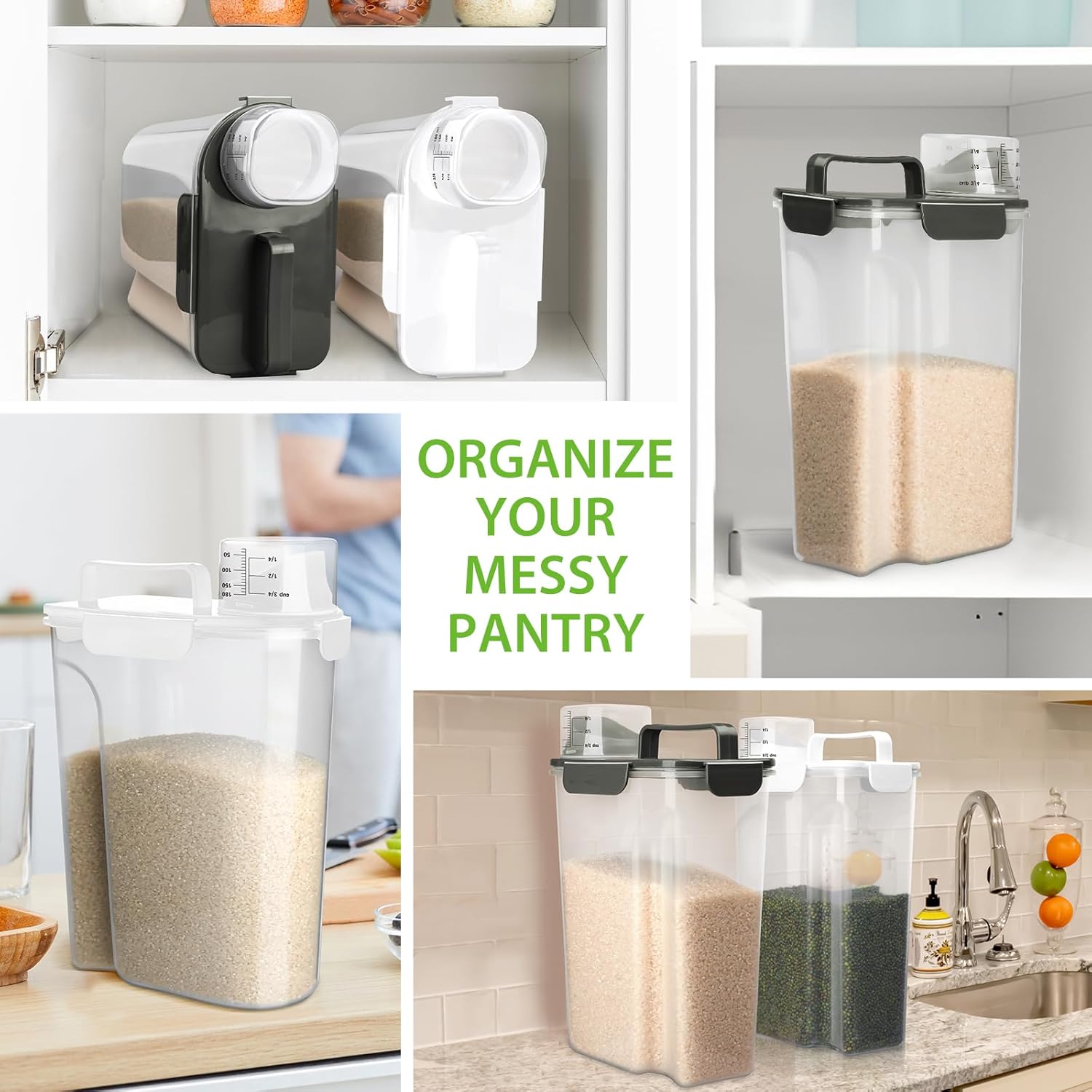 - CLEAR VISIBILITY&ORGANIZE BETTER- Clear container lets you identify contents at a glance. The rice container storage will keep your kitchen pantry neat and organized. And portable handle, easy to move and go out