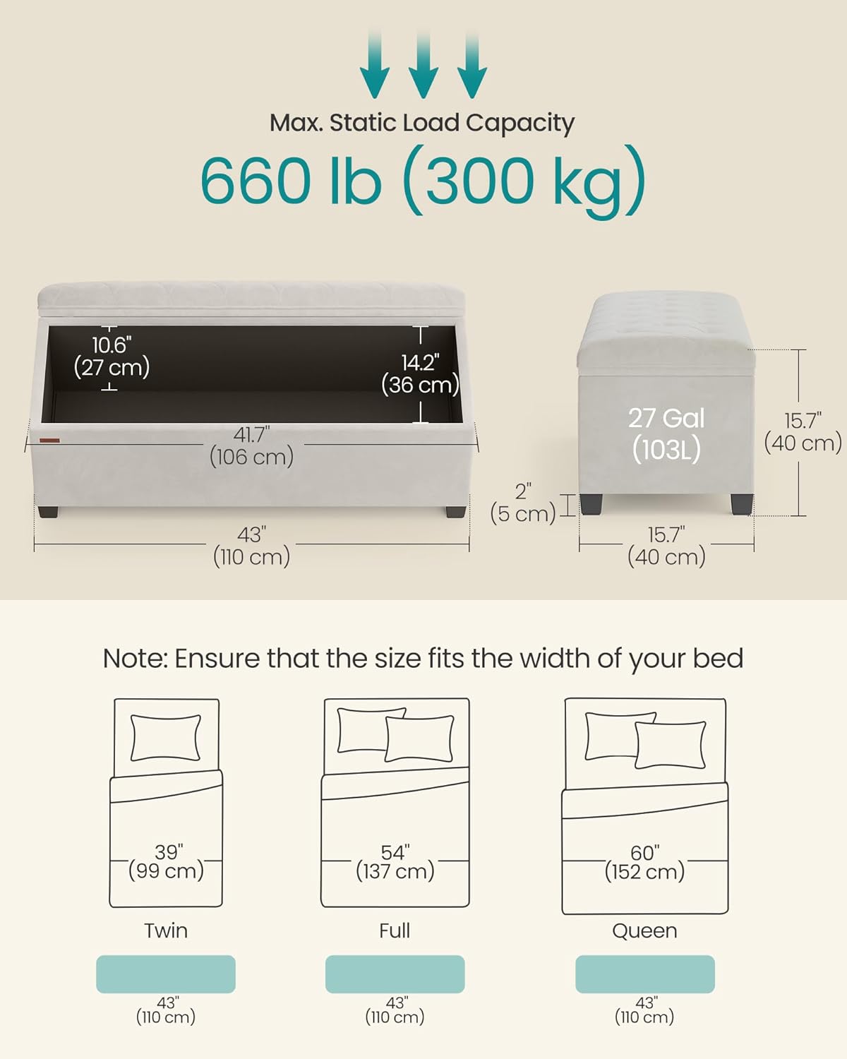 - γSPACIOUS STORAGEγSized at 15.7"D x 43"W x 15.7"H (40 x 110 x 40 cm), this bench offers a 27-gallon (103 L) volume for your blankets, books, and bed sheets