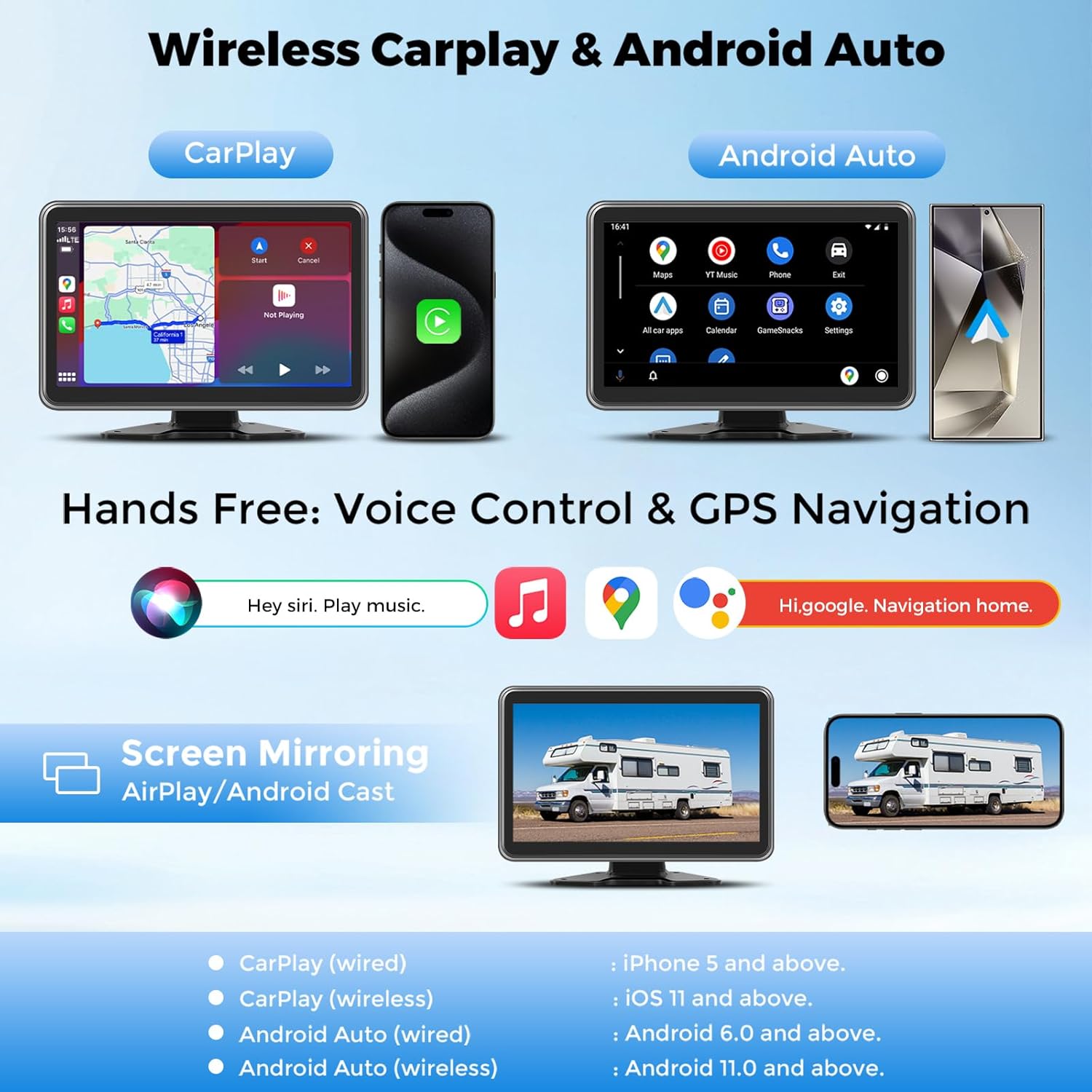 - γAll-in-One CarPlay with Backup Camera SystemγGet ready for a whole new driving experience with this amazing CarPlay screen back up camera systems for trucks, RVs! CarPlay & Android Auto, AirPlay & Cast! The smartphone connects to the 10-inch HD full touch screen to enjoy real-time navigation, music, and video via Bluetooth or radio connection to the car stereo. With a dual-camera back up camera for truck.rv that focuses on improving driving safety, this is the ultimate driving experience!