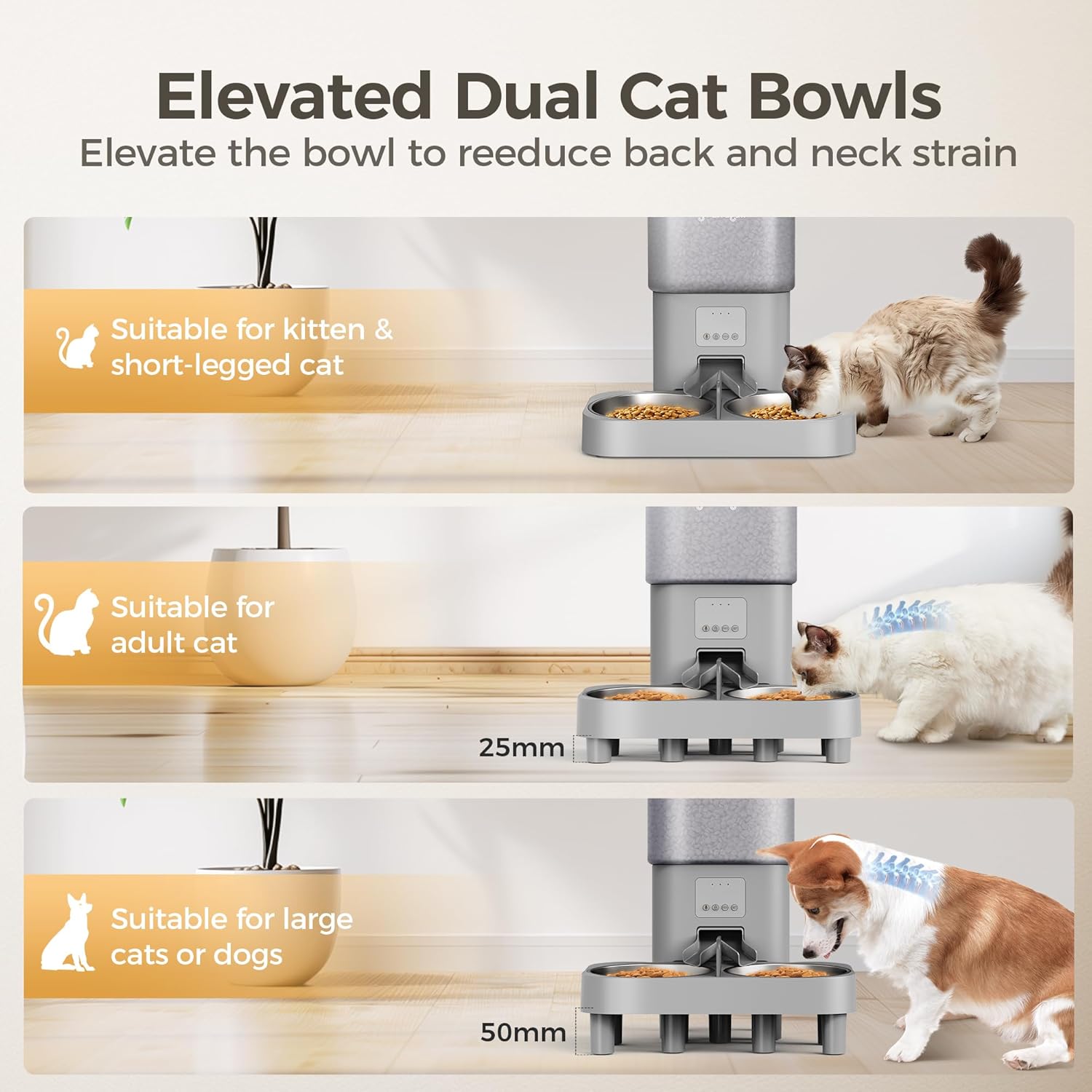 - Elevated Foot Feeder: This cat food dispenser comes with three different sizes of pillars and non-slip foot pads. The 6Β°tilted and elevated food bowl reduces the strain on pets' bones during feeding, catering to pets of varying heights as they grow. It's suitable for various breeds of cats and dogs