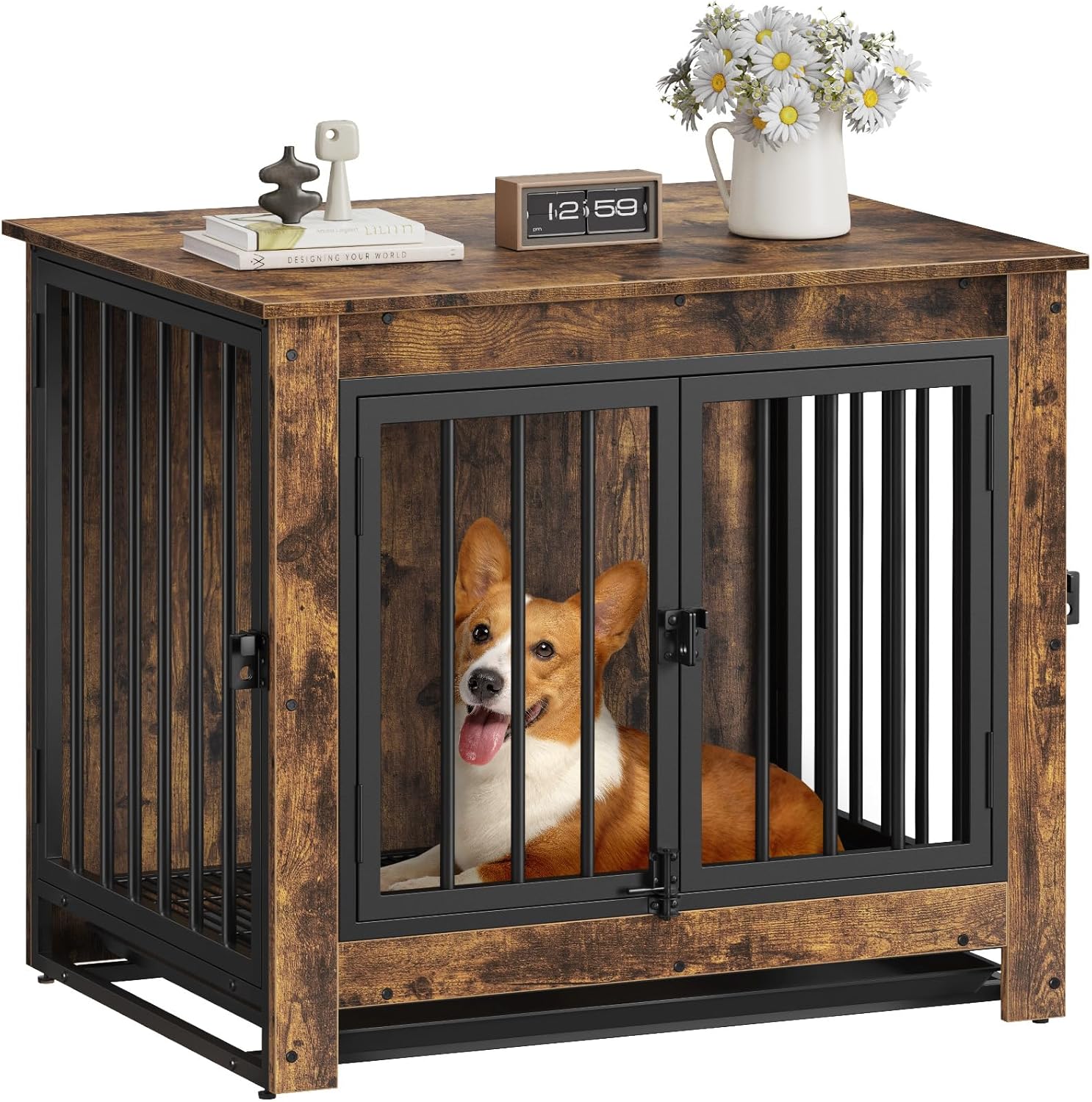 Dog Crate Furniture, Dog Crate End Table for Small and Medium Dogs,Wooden Cage Kennel Furniture Indoor, Modern Dog Crate with Multi-Purpose Removable Tray, Double-Doors Dog Furniture, Rustic Brown