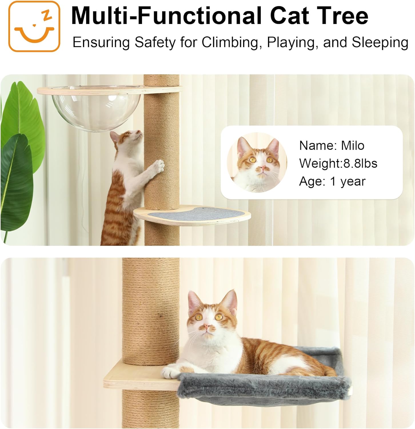 - SATISFY NATURAL INSTINCT - Cats naturally like heights, climbing to high places can burn off their excess energy and enhance their sense of security. This 6 level tall cat tree comes with ex-large soft hammock, 360Β°view transparent capsule, semi-enclosed cat condo and view perch. Cats can nap, scratch, and play in this cat climbing tree, one cat tree can satisfy all their needs.