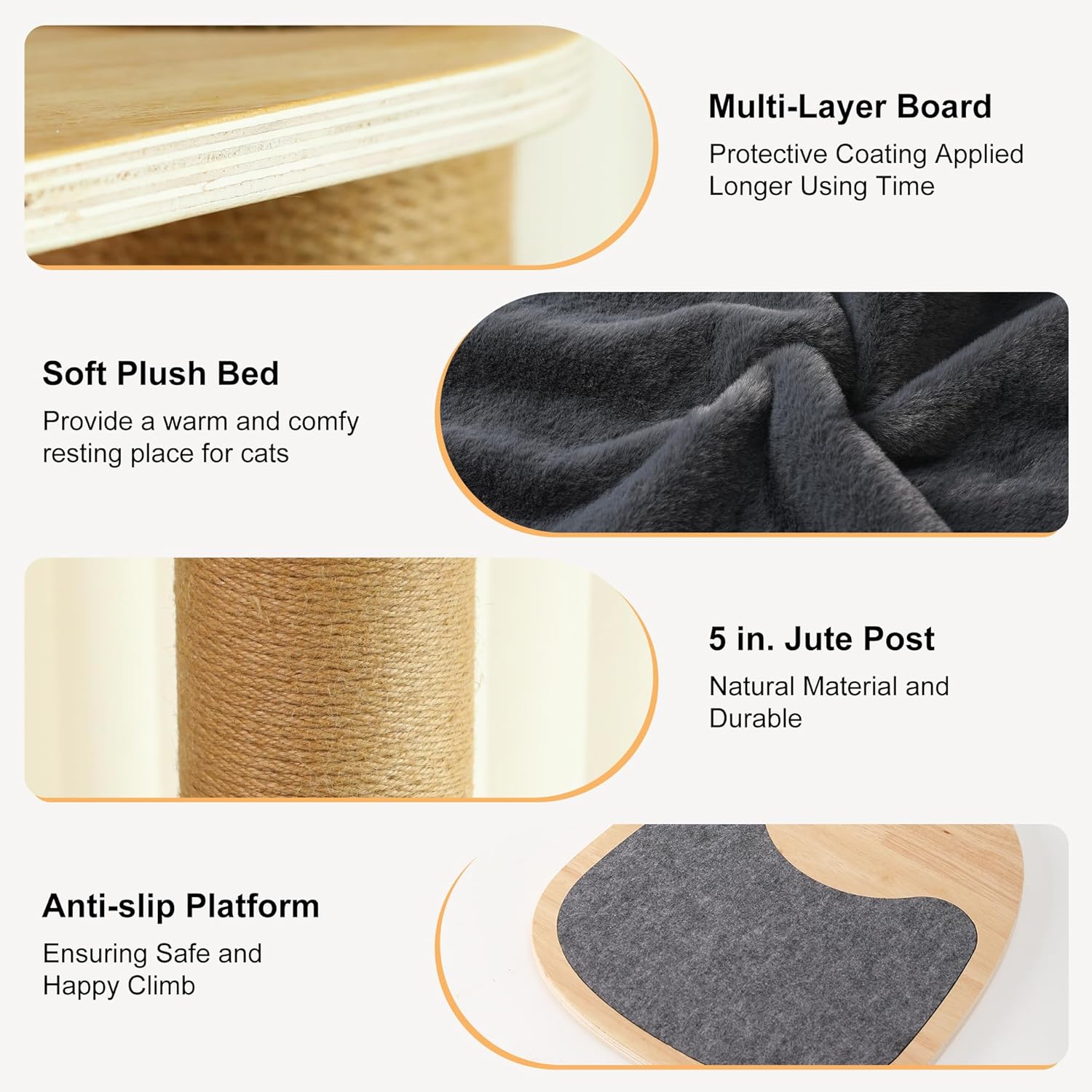 - PREFERRED MATERIALS - The main structure of the cat tree is made of rubber wood plywood and jute, durable and can withstand the scratching and weight of cats, extending the service life. Soft plush and felt mats are used on the viewing shelf to ensure the comfort and safety of pets.