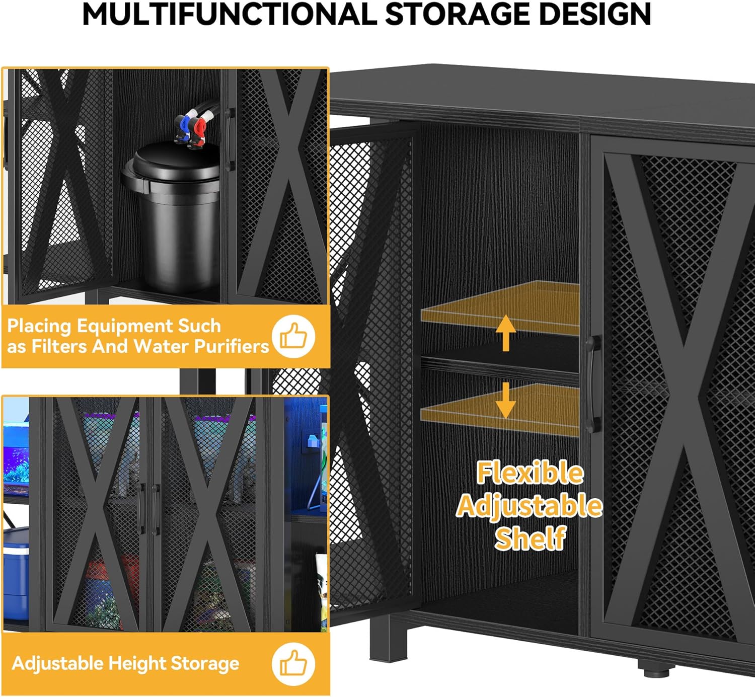 - Orderly storage: This fish tank with stand easily keeps everything organized. The built-in cabinet stores fish food, cleaning tools, and other accessories while the adjustable shelves help accommodate items of various sizes