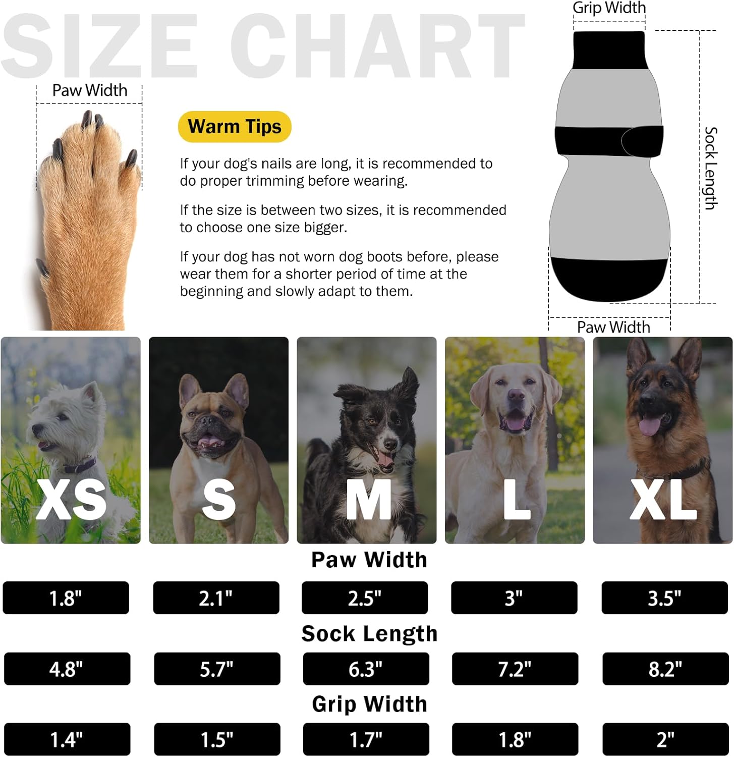 • SIZE GUIDE: XS-Paw width 1.8in, sock length 4.8in. Please be sure to measure your pet before purchasing. If the paw width is between two sizes, please choose the larger size. Includes 6 dog grip socks (two more available for replacement than other sets).
