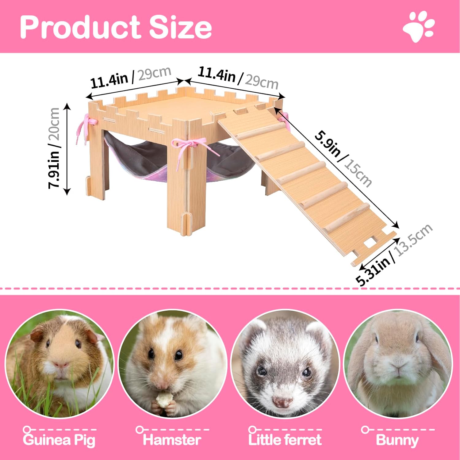 Guinea Pig Hammock with Platform and Ramps,Wooden Small Animal Hideout with Waterproof Coating Mat Hammock,Guinea Pig Cages Accessories Toys Hiding Playing,Easy to Clean(Single)