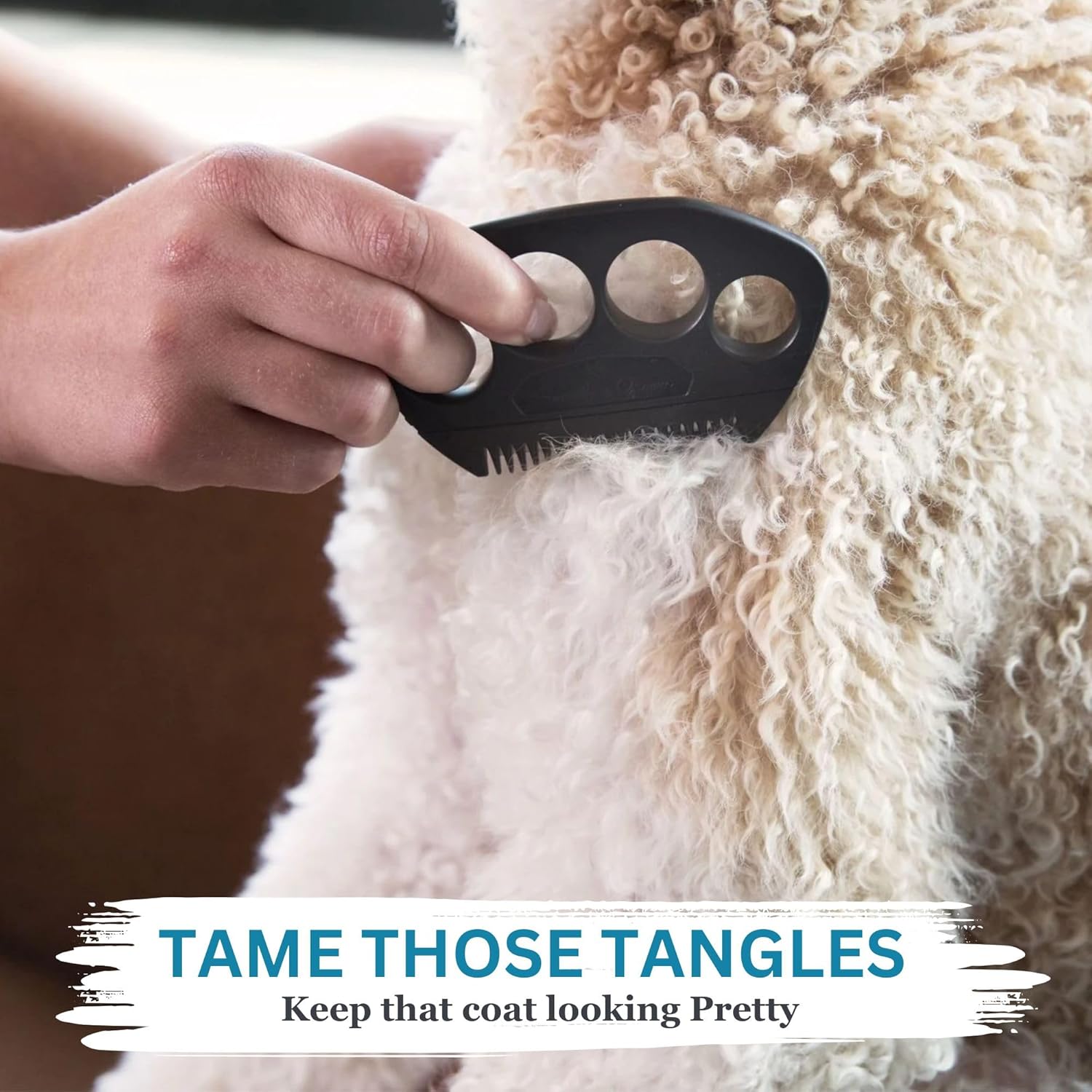 - Plastic comb with comfortable finger holes. Can be used with either hand. Will take care of stubborn mats and tangles.
