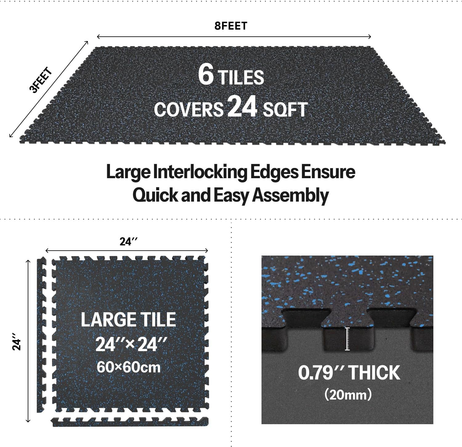 - [Easy to Assemble and Detach]: 6 tiles (24" x 24" x 0.79" each), covers 24 sq ft (6 Γ 4 ft). Upgraded larger interlocking locks provide a secure fit, preventing any separation during use, ensuring you can work out without concerns of shifting. Simple assembly and detachment make it effortless to set up your home gym.