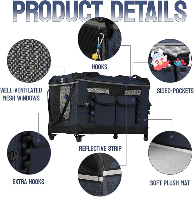 - 【EASE OF ROLLING】The rolling travel dog crate with detachable wheels makes it easy for vet visits, long journeys, shopping, or walks ect.. The 360° rotating dual front wheels ensure smooth, quiet, and easy movement in any direction. Additionally, the rolling dog crate features the carrying handles and adjustable shoulder strap for convenient transport.