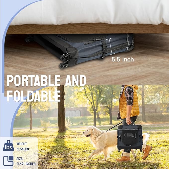 - 【ROOMY TO REST AND PLAY IN】It is roomy enough to allow your dog to stretch out comfortably during travel or downtime at home. It can be used as an indoor pet house or an outdoor dog crate. The soft dog crate (without wheels) measures 30x21x21in and is suitable for pets up to 44lbs.