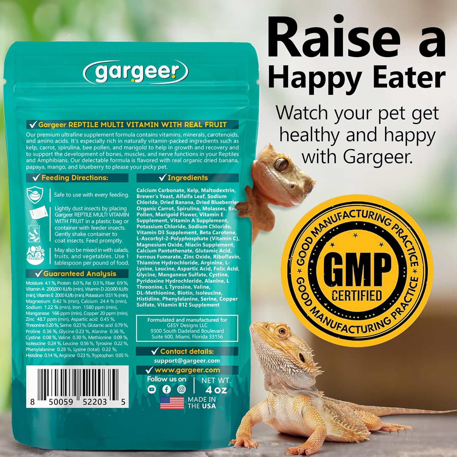 4oz Reptile Multi-Vitamin Supplement. Premium Ingredients, Rich with Organic Fruit, for Full Growth and Development Support. Boosted with Minerals and Amino Acids, Proudly Made in USA. Enjoy!
