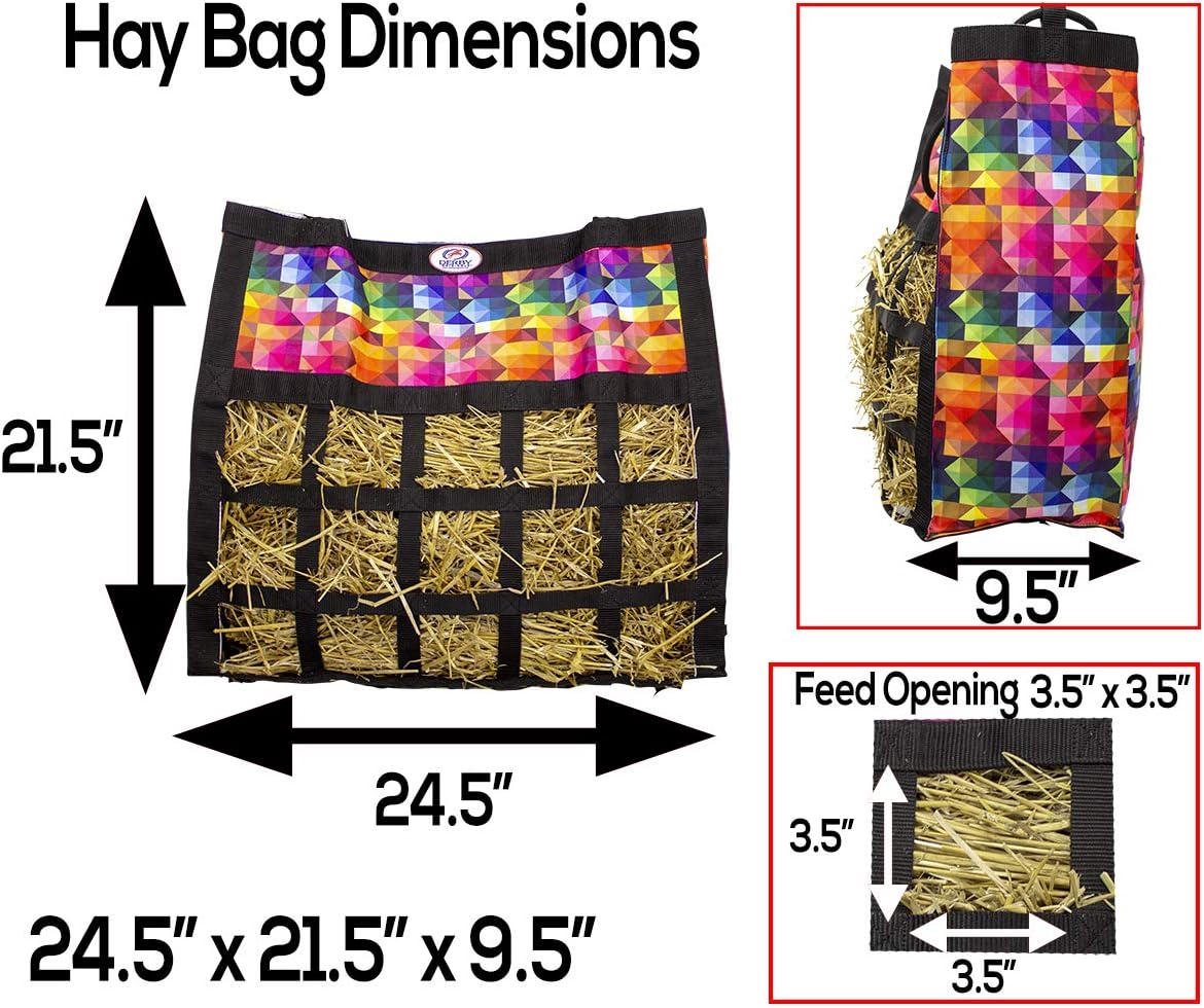 - HOLDS 2-3 FLAKES OF HAY - this 24.5"x9.5"x21.5β hay bag with 3.5" square openings holds approx. 2-3 flakes of Timothy, Orchard, Alfalfa, or any other type of hay. Our hay bags were designed to minimize frustration and can be stuffed in seconds.